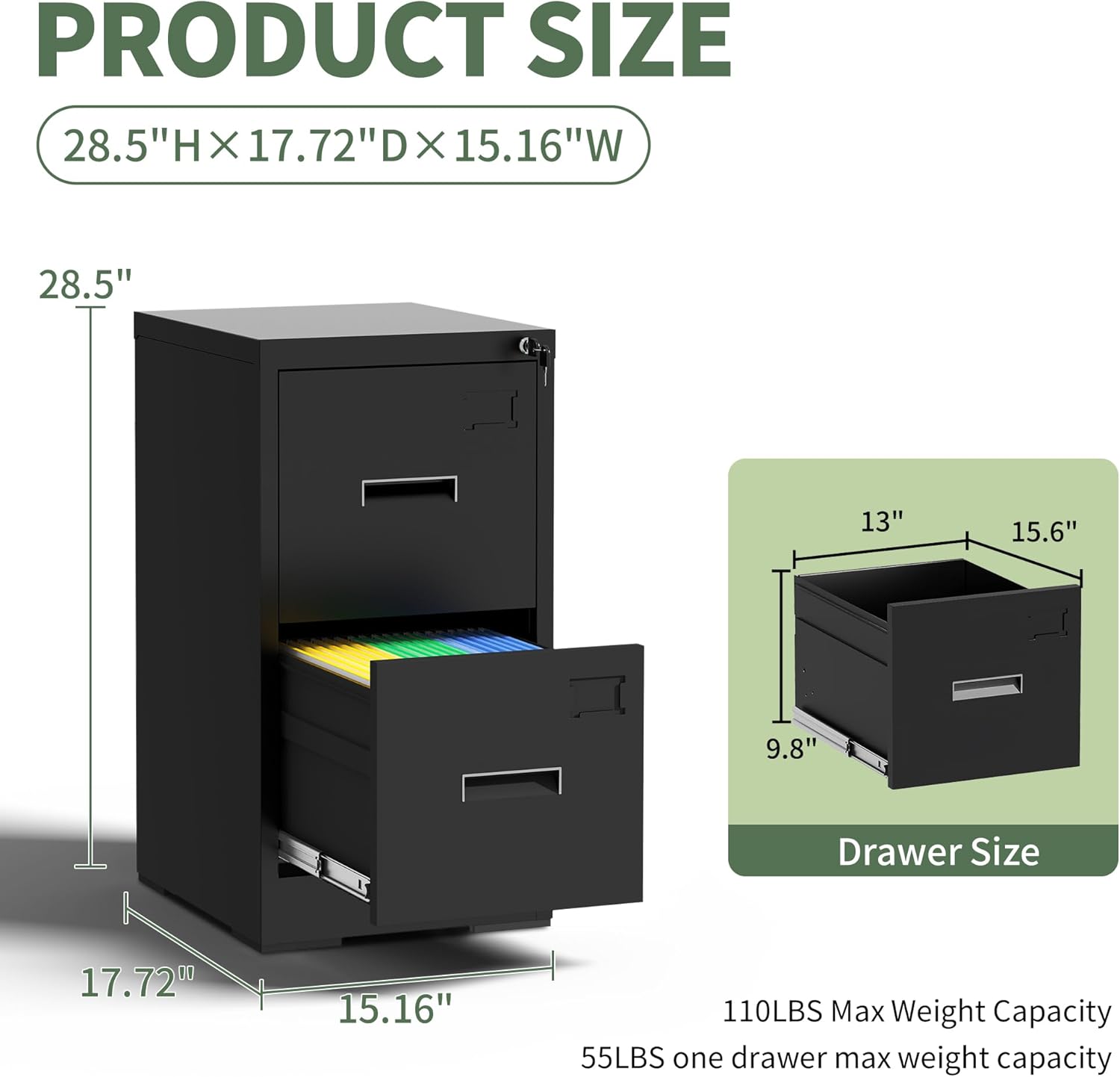 2-Drawer Locking Vertical File Cabinet, Metal Storage Cabinet for Office/Home – Secure Vertical Filing for Letter/Legal/A4/F4 Documents, Easy to Assemble Steel Cabinet (Black, 2 Drawer-15W)