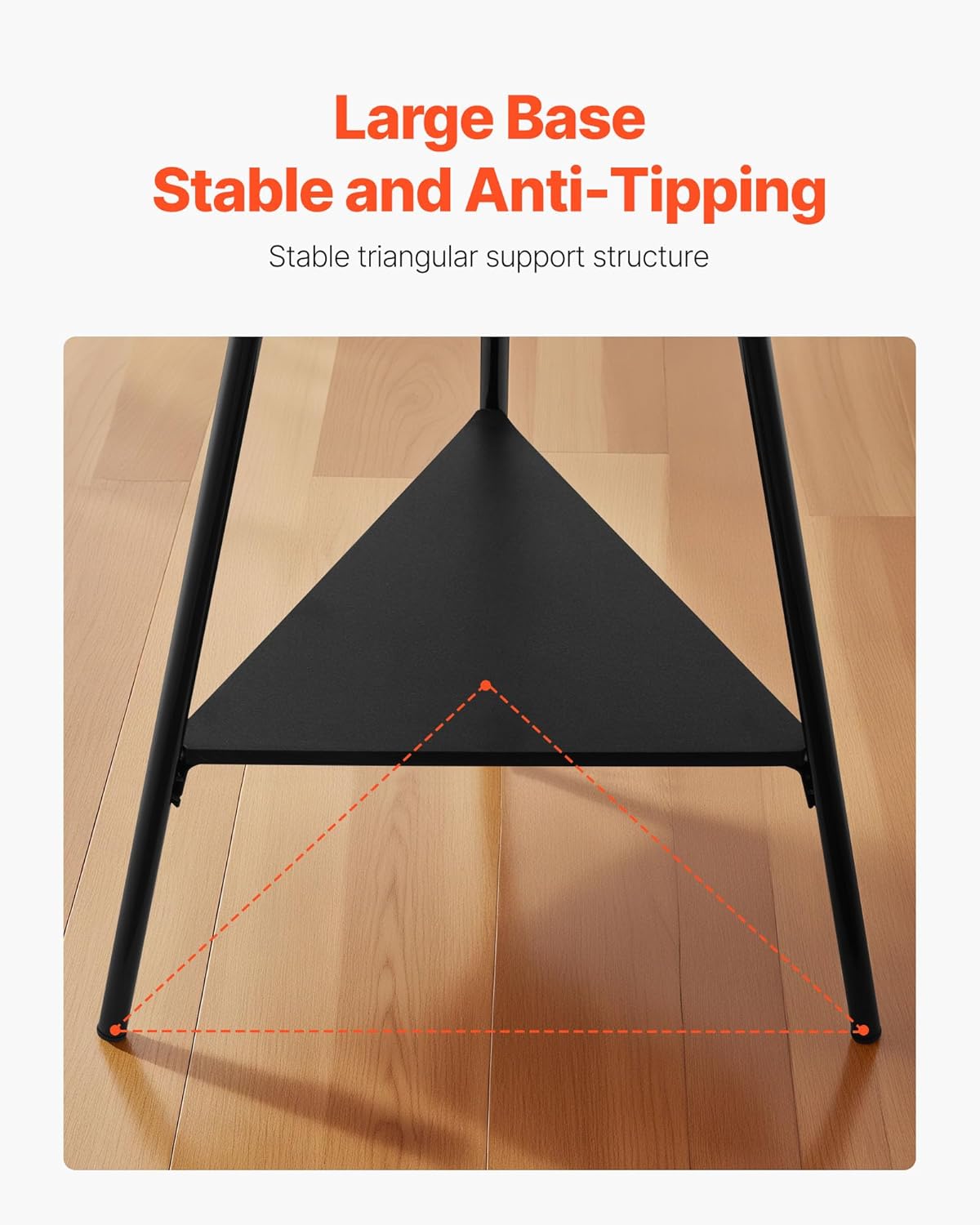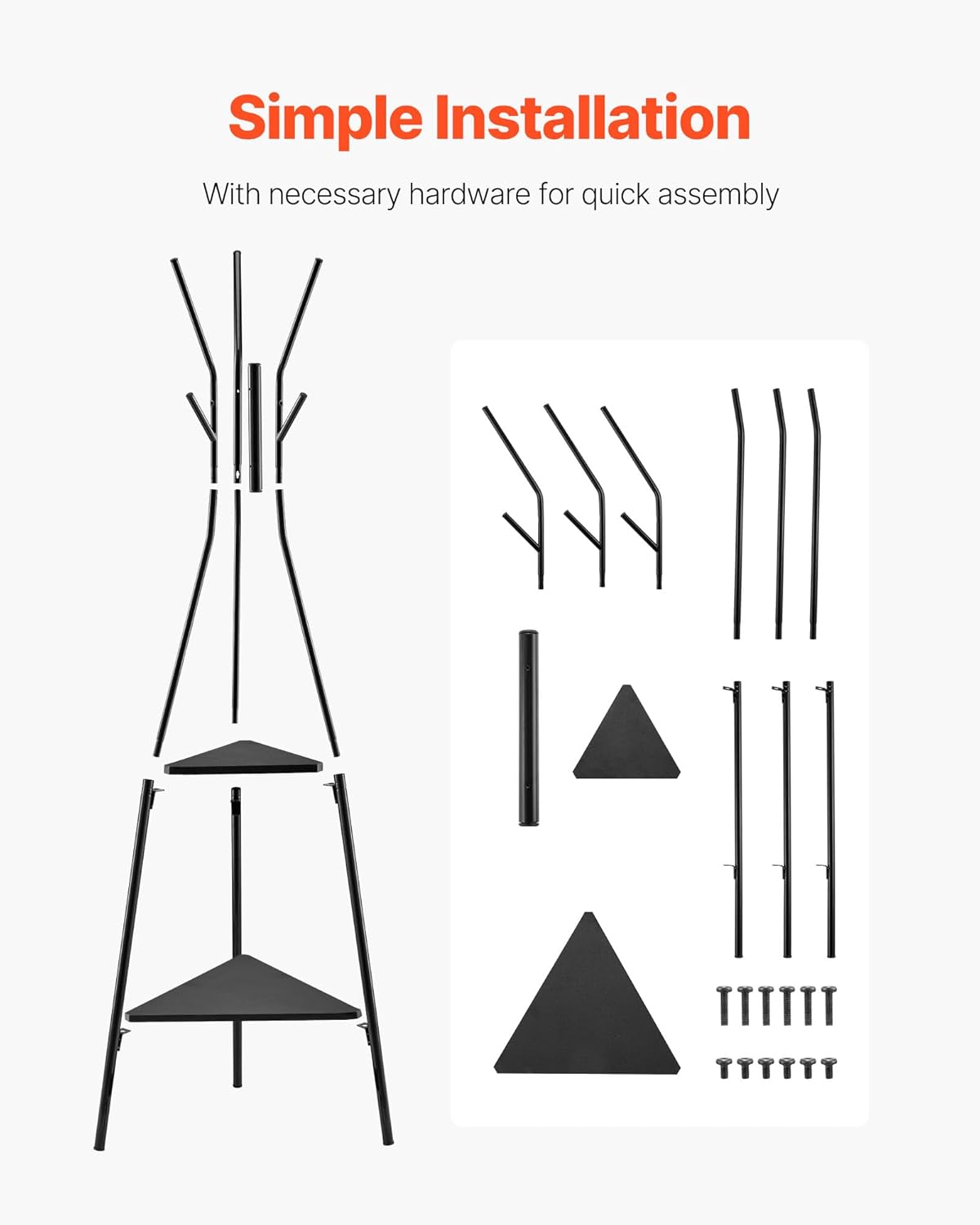 - Strong Load Capacity: Create a tidier home space with VEVOR coat rack. It features a stable triangular structure, 6 hooks, 2 storage shelves, and a thickened carbon steel main rod. Each hook holds up to 6.6 lbs (3 kg), with a total capacity of 22 lbs (10 kg), providing stable support for hanging coats, hats, bags, and more