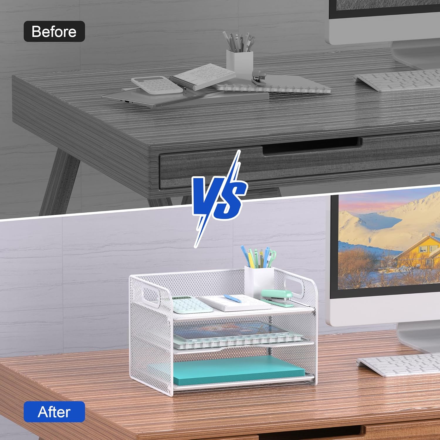 Samstar 3 Tier White Letter Tray Paper Organizer with Handle, Mesh Desk Organizer Paper Sorter File Rack Shelves, White