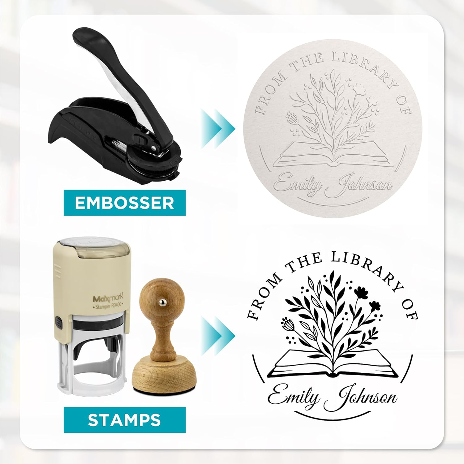 Custom Library Embosser - Style 110 - Embosser, Wood Stamp or Self Inking Stamp - Book Embosser Includes 50 Gold Seals - Custom Stamp Seal from The Library of