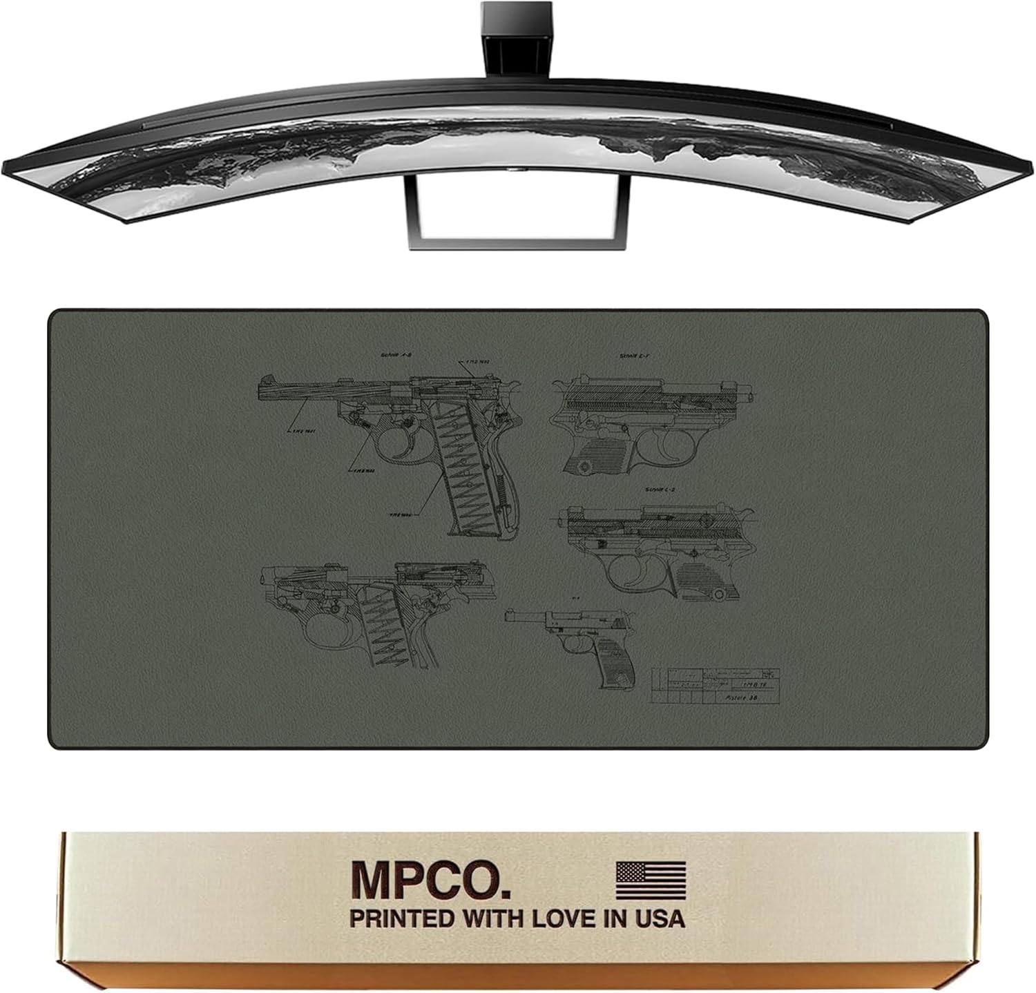 MPCO. Blueprints Large Gaming Desk Pad - 36" x 17" Duraglyde Fabric Pistol 38 – Green Desk Mats - Non-Slip, Washable, Smooth Glide for Precision Gaming & Work