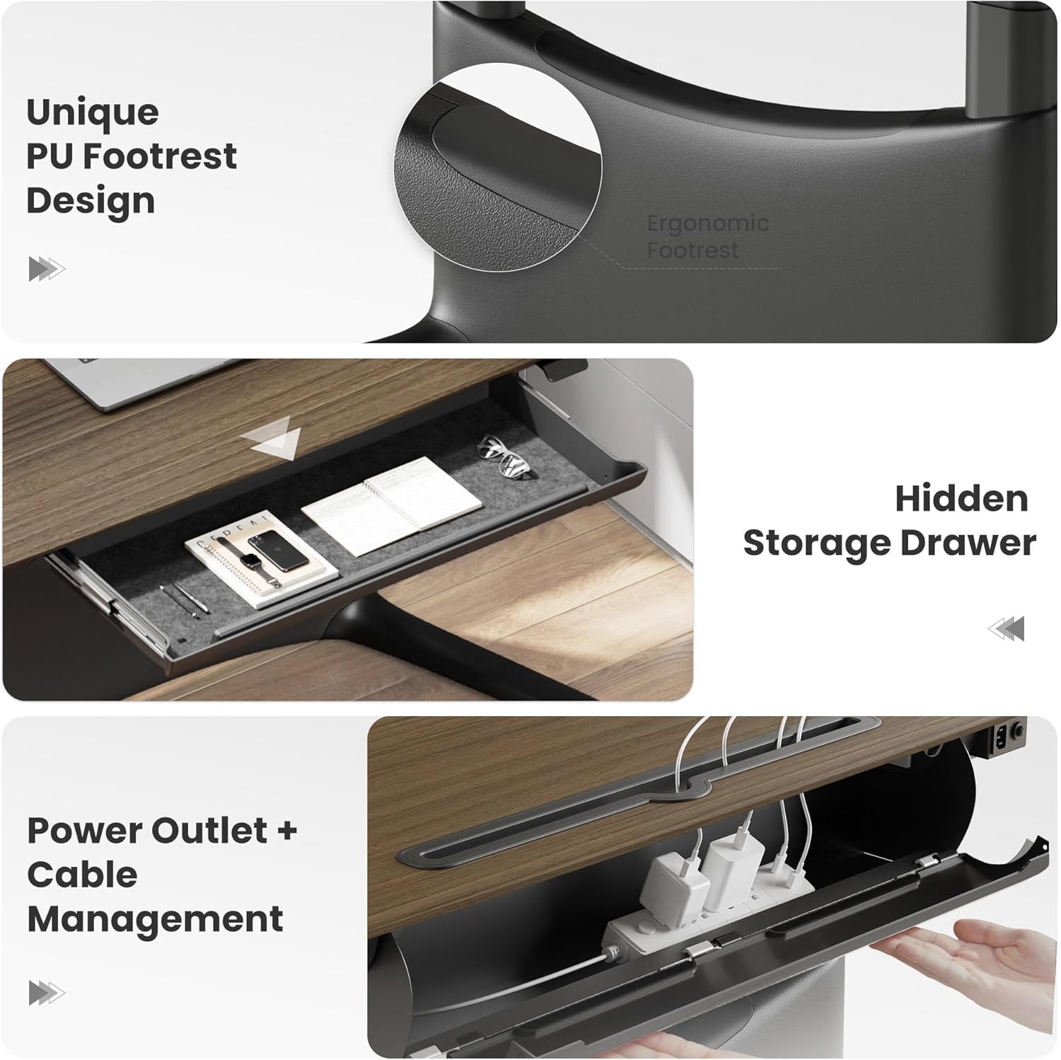 - ăErgonomic Footrest for Flexible PostureăWhether sitting, standing, lounging, or cross-legged, the built-in footrest supports your legs in any position. Reduce pressure, enhance comfort, and boost productivity.