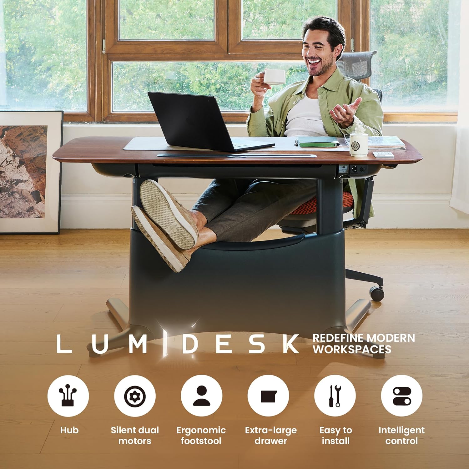 - ăPremium Whole-Piece Desktop & Sturdy FrameăCrafted with FSC-certified MFC and natural veneer, the one-piece desktop offers a seamless, elegant surface with stunning natural wood grain. Paired with a carbon steel frame weighing 122 lbs, it delivers rock-solid stability and long-lasting durability. Suitable for any use scenarioâthis adjustable desk can be used as an office desk, studio desk, study desk, gaming desk, computer desk and more!