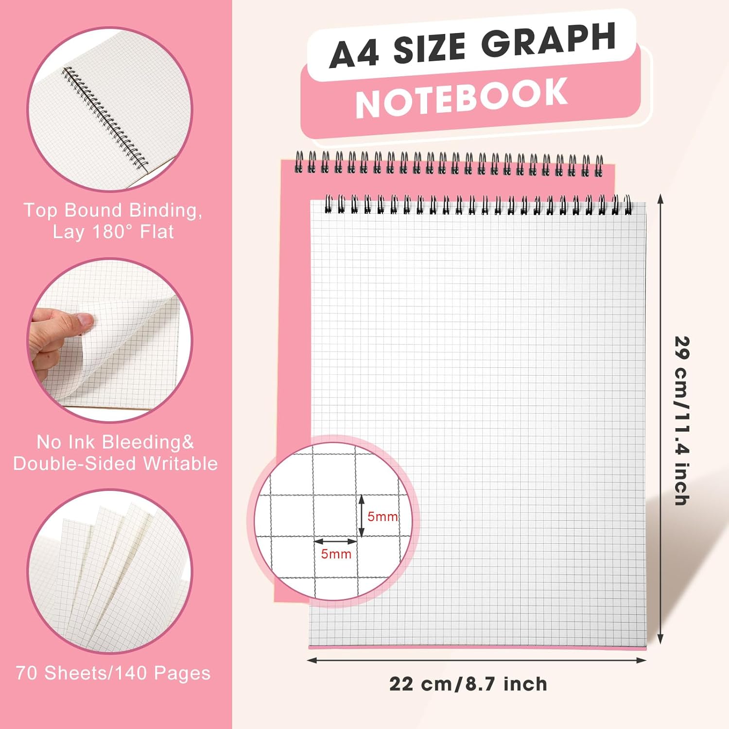1 Pack Top Spiral Graph Paper Notebooks 8.7 X11.4 Inch A4 Grid Paper Notepad 70 Sheet Memo Steno Pad for Engineering Writing Sketching Drawing School Office Supplies (Pink)