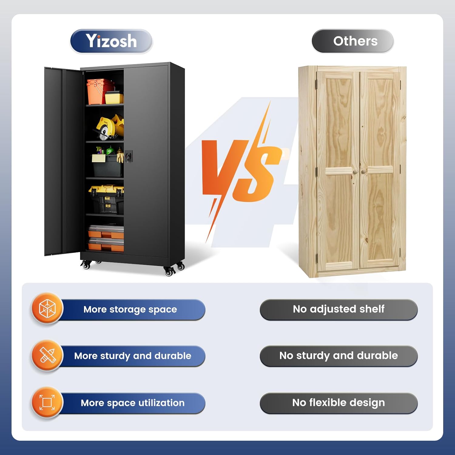 - 『Detachable & Lockable 360° Swivel Casters』:Yizosh Metal storage cabinet with wheels is easy to move around.It has a strong and durable metal frame with excellent load-bearing capacity, allowing you to store enough items.