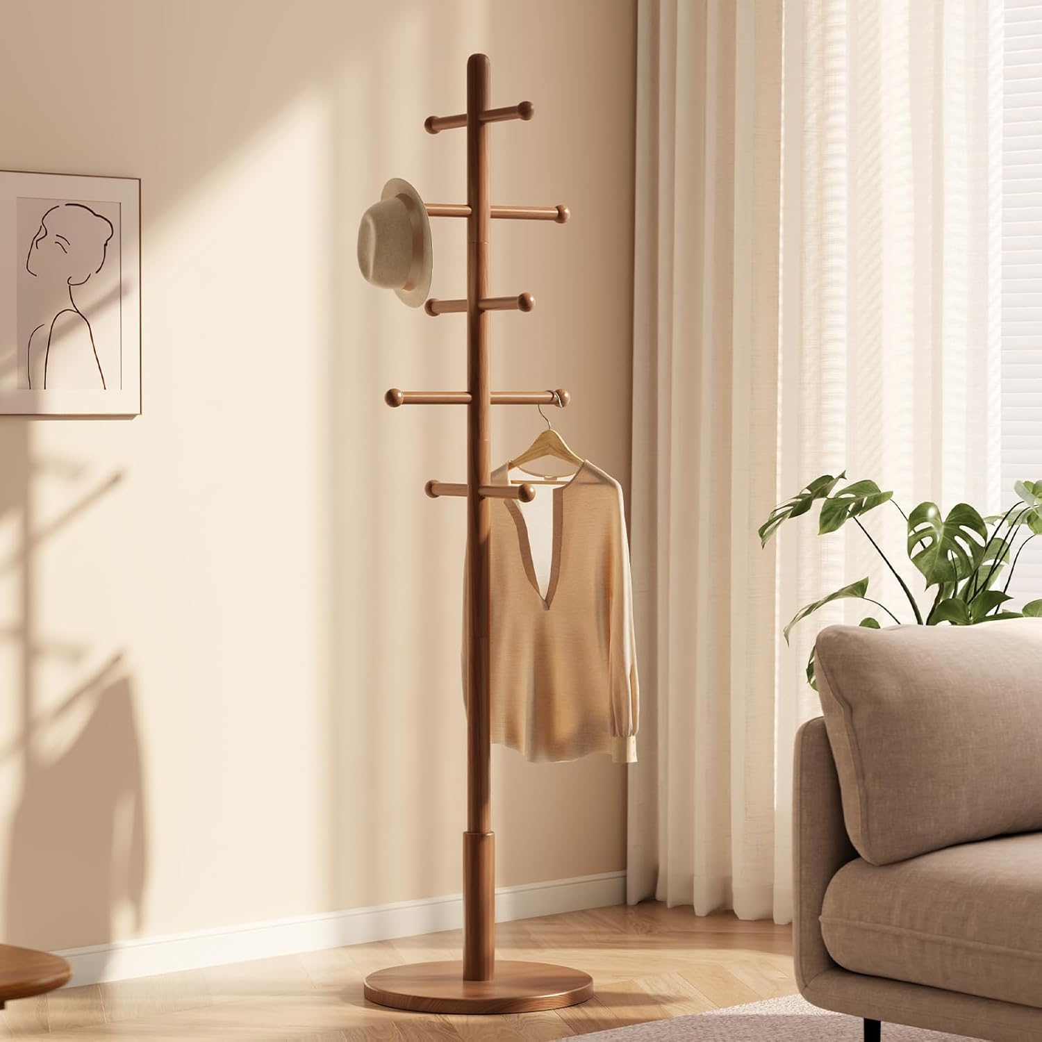 - 【PREMIUM MATERIAL】 Crafted from 100% FAS rubberwood and without artificial synthetic boards, this standing coat rack tree delivers strong, stable, and lasting performance, enhances any home with its stunning grain and walnut-brown finish, adding warmth and elegance