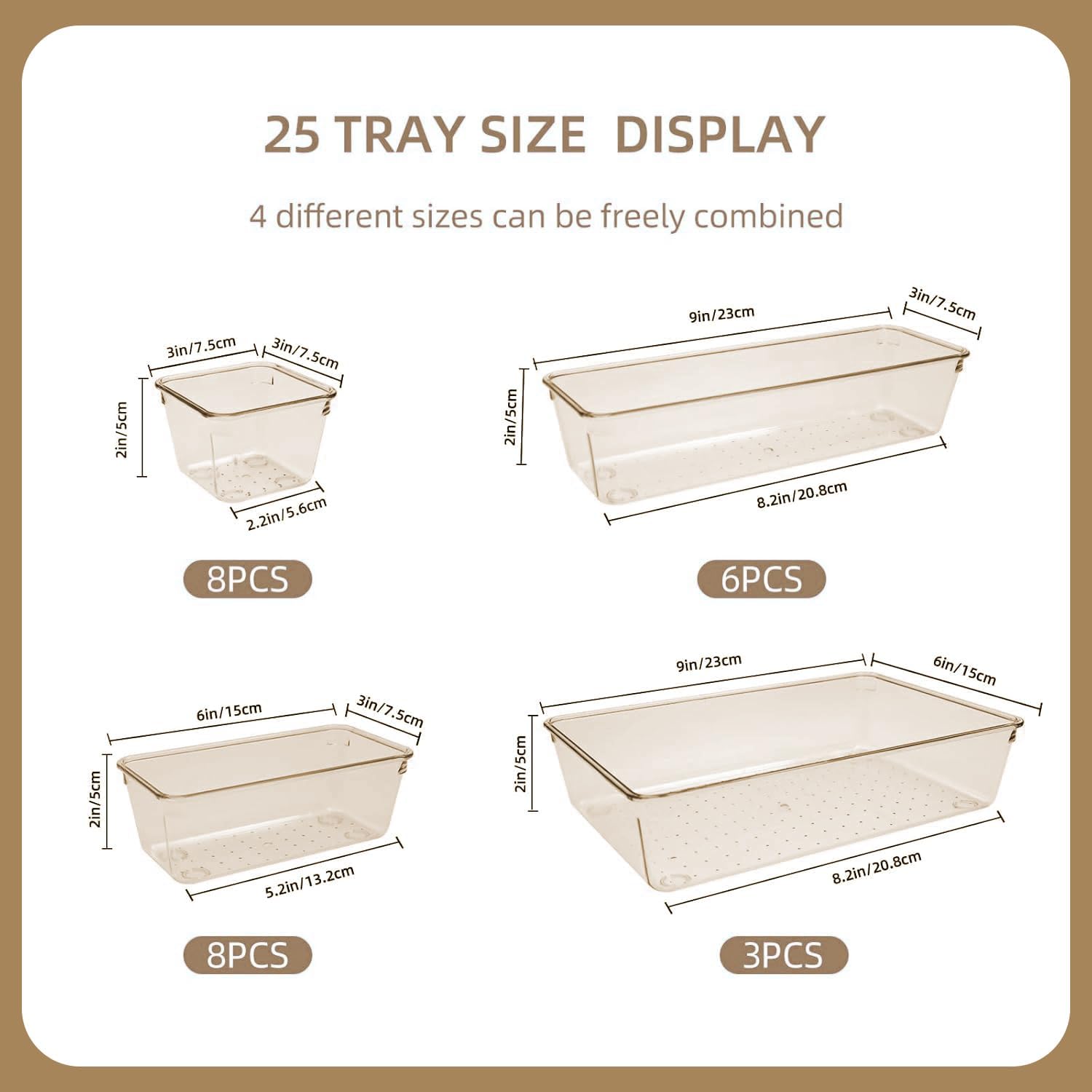 - ă4 SIZE Clear Champagne MAKEUP DRAWER ORGANIZER TRAYSă Total 25 PCS: 9 x 6 x 2 inches (3 pcs), 9 x 3x 2 inches (6 pcs), 6 x 3 x 2 inches (8 pcs), 3 x 3 x 2 inches (8 pcs), help you customize the combination to store items and organize drawers on shelves.