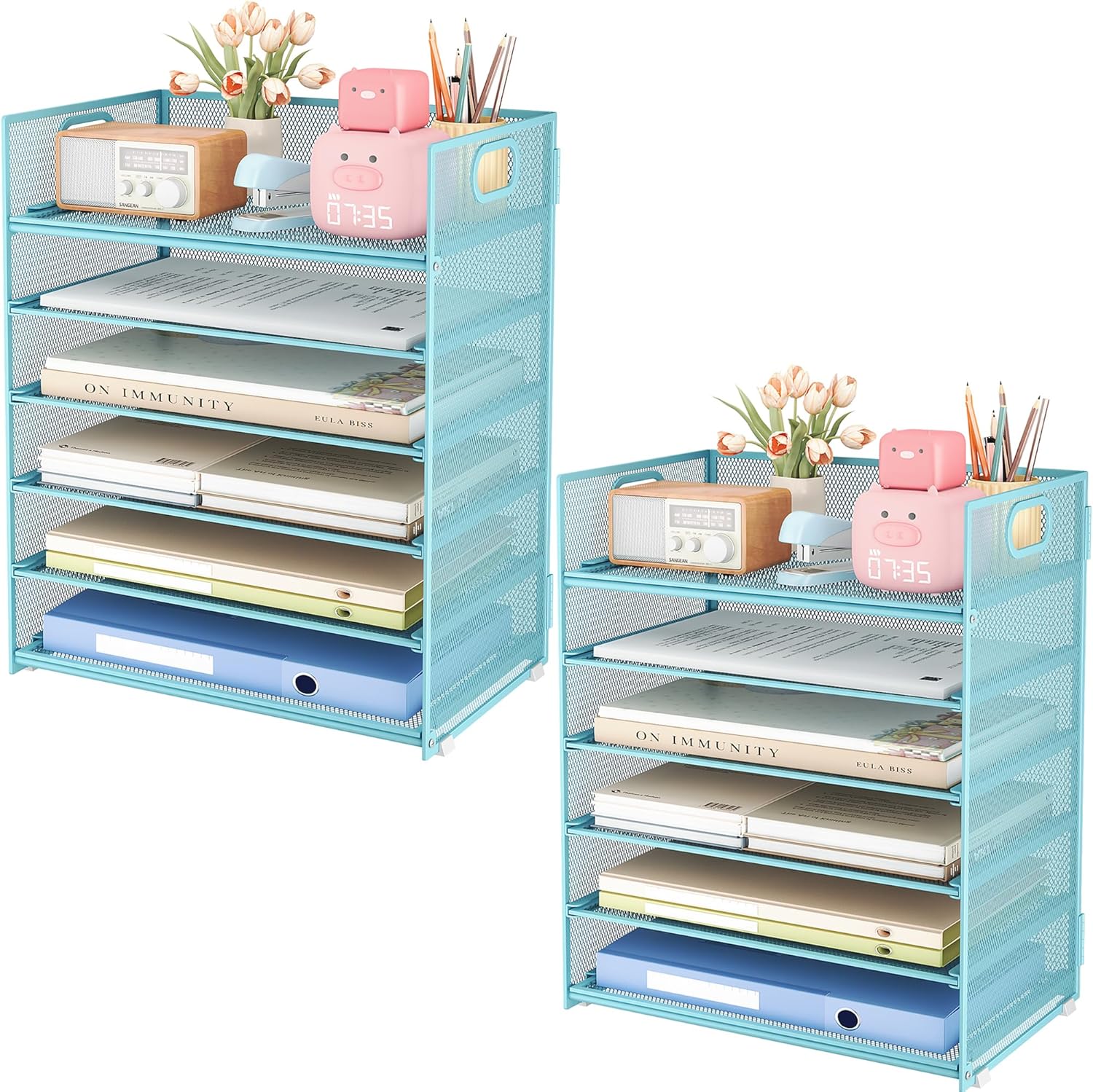 Subekyu 6-Tier Desk Paper Organizer, Desktop File Letter Tray with Handle, Document Sorter and Accessories Holder for Office, Home and School Workspace Organizers, Blue-2 Pack