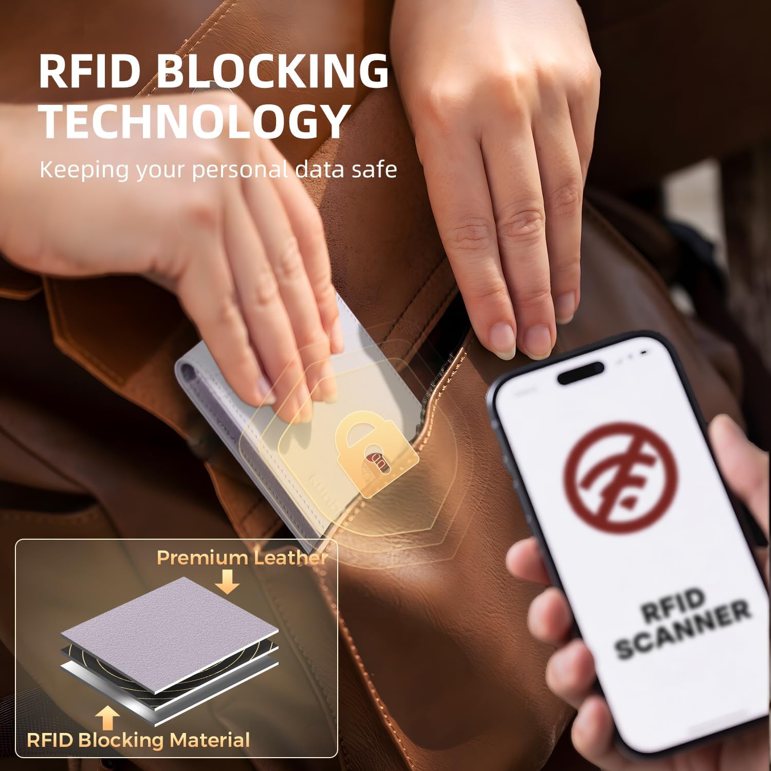 - RFID blocking- Our wallets are equipped with advanced RFID SECURE Technology, a unique metal composite, engineered specifically to block 13.56 MHz or higher RFID signals and protect the valuable information stored on RFID chips from unauthorized scans. License and ID cards will be protected effectively. Blocking the 13.56 MHz band and protect against data theft by RFID scanners.