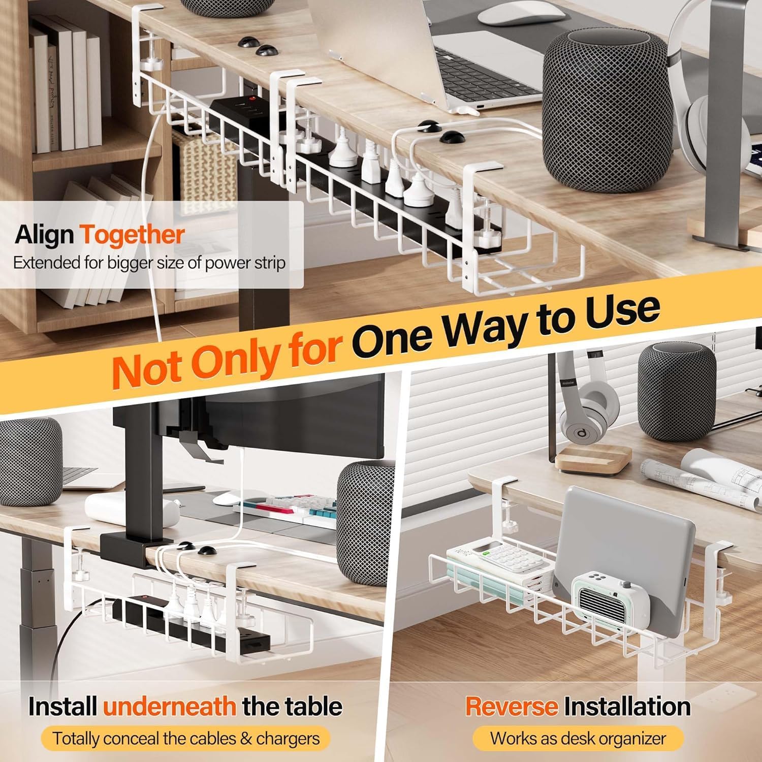 - 👍【What You Will Get 】Great value under table cable management kit contains 3 cable trays, 8 cable clips and 4 cable ties. When you place 3 racks align, you will have a extra long 47.1" under desk cable management tray. Suitable for long power strips and multiple devices. This computer cord organizer is great for you not only around your desk table, but also good to be used in the kitchen and outdoors. Tidy and beautify your office and home.