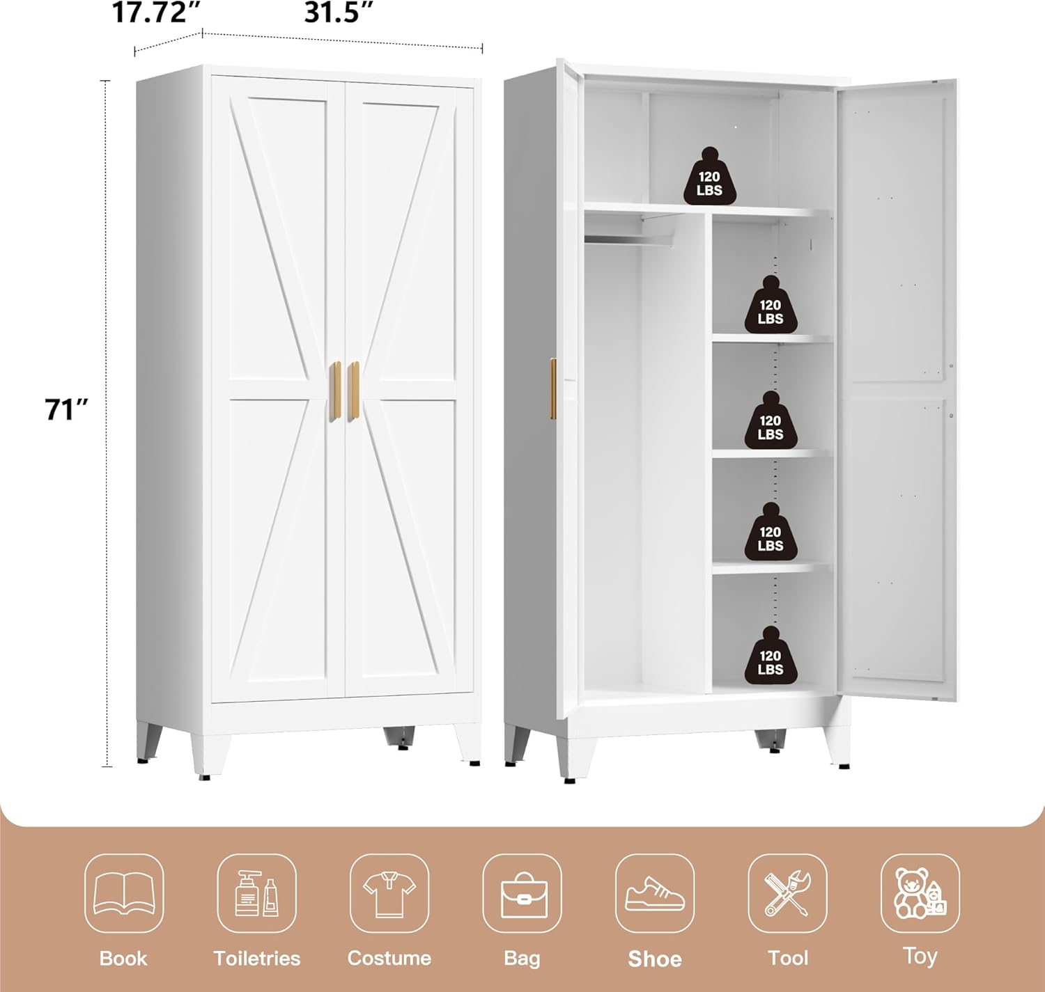 71" Tall Metal Wardrobe Closet with Adjustable Shelves and Hanging Rod, 2 Doors Office Storage Locker Cabinet for Home, Office, Bedroom, Laundry Room, White