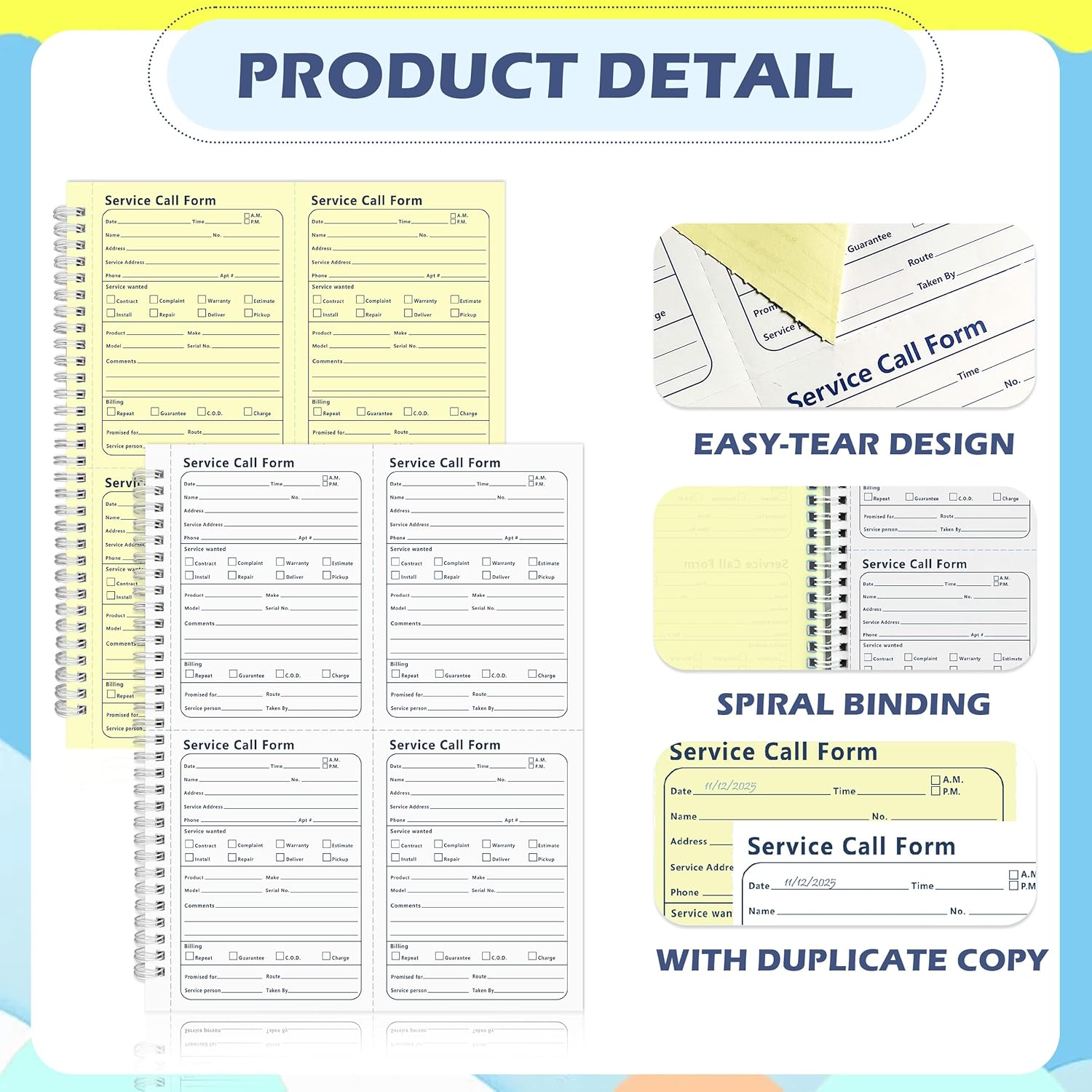 - Durable Spiral Binding for Convenience:Metal spiral binding keeps all 200 sets securely bound Pages turn easily and lay flat while filling out Tear off cleanly for customer copies Ideal for mobile repair professionals