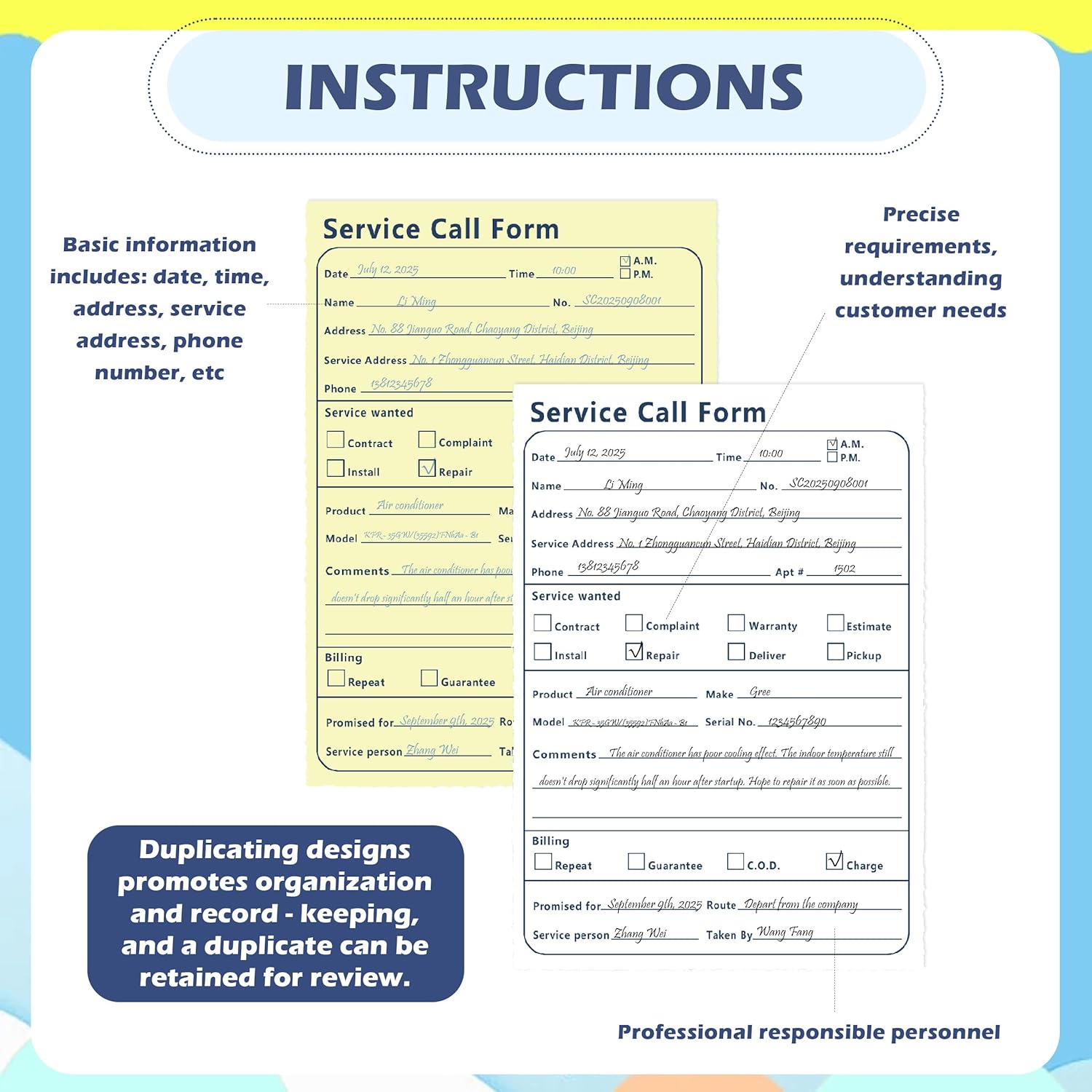 - Large 8.5x11 Inch Format with Easy to Understand Fields:Each form includes clearly labeled sections for Date Time Customer Name Contact Number Address Service Address Phone Apartment Number Type of Service Product Make Model Serial Number Comments and Billing Method Ideal for technicians to quickly document every job accurately