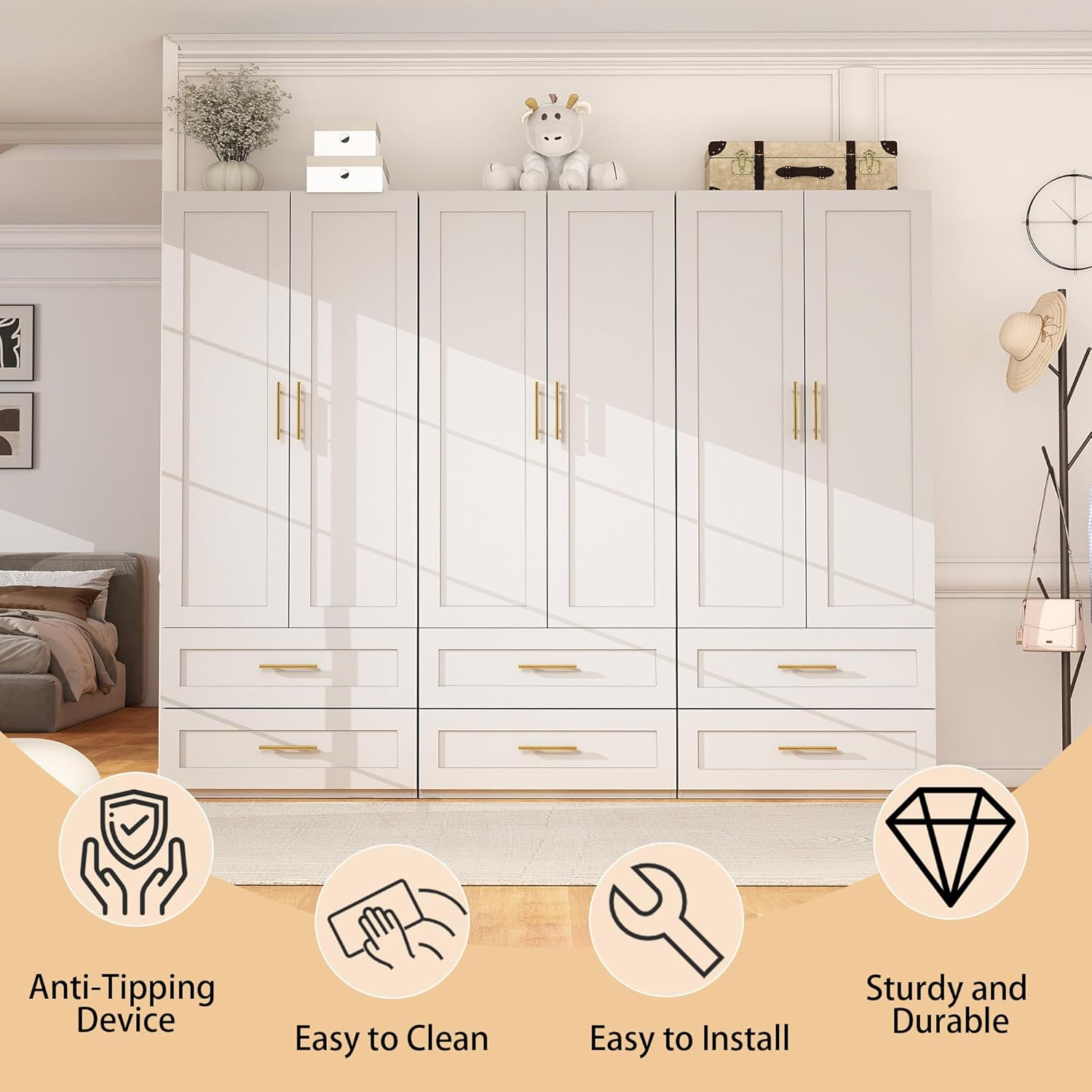 - Premium Materials: Crafted from high-quality engineered wood, the wardrobe with drawers and shelves offers lasting durability. The surface of the white closet with doors is specially treated to resist wear and scratches while being easy to clean, ensuring it stays looking great even with everyday use. For added safety and stability, the free standing closet with doors includes an anti-tip device—making it especially suitable for homes with children or pets.
