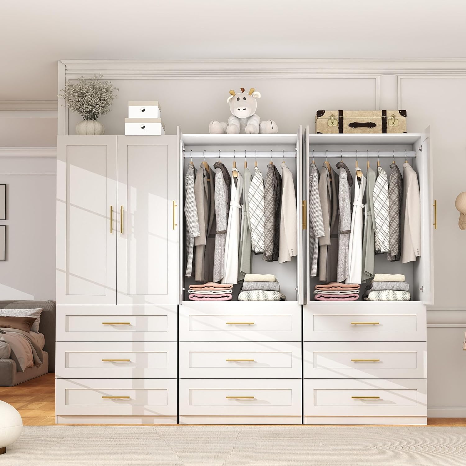 White Wardrobe with 6 Doors: 75" Tall Armoire Wardrobe Closet with 9 Drawers, Bedroom Closet Cabinet for Hanging Clothes, Wooden Storage Armoire with Shelves (Modern, 3)