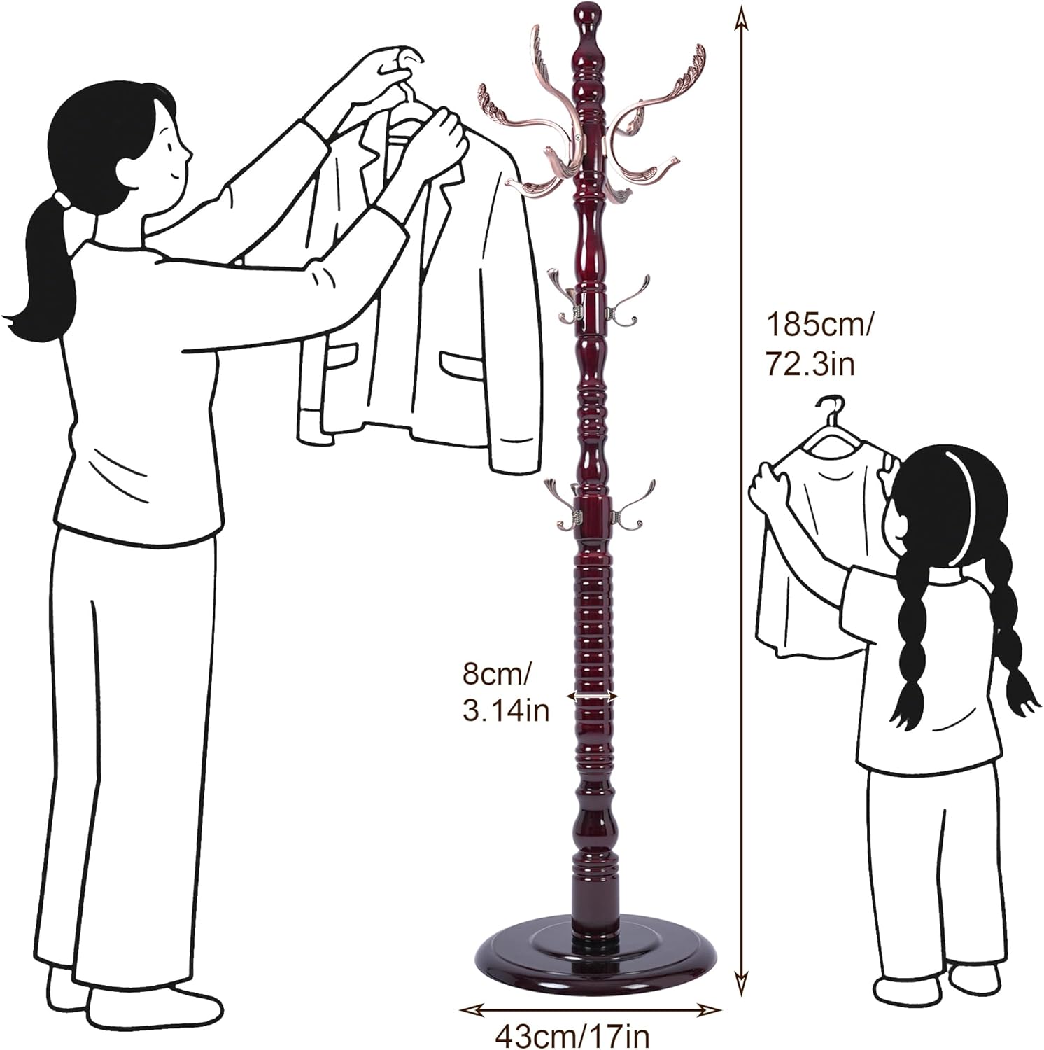 Vintage Free Standing Coat Rack with Disc Base, Solid Wood Coat Hanger Stand with 20 Metal Hooks and 3 Adjustable Size, Standing Coat Rack Tree for Entryway, Bedroom, Hallway, Office, Apartment