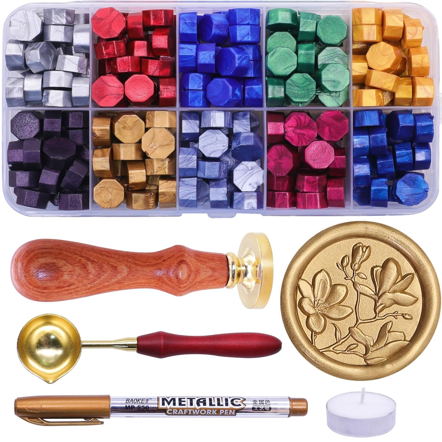 SWANGSA 3D Magnolia Wax Seal Stamp Kit with 200pcs Sealing Wax Beads, Great for Embellishment of Wedding Invitations, Wine Packages, Gift Wraps
