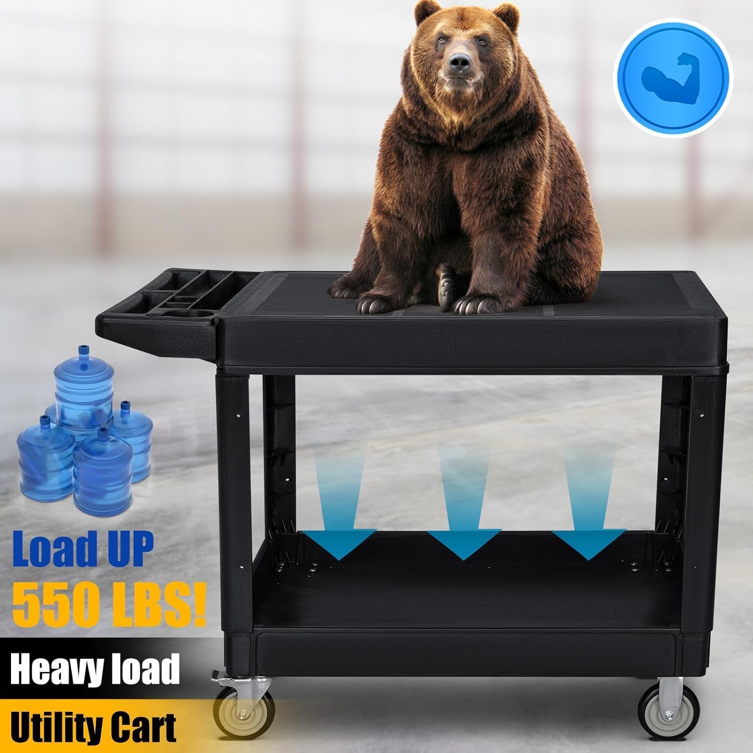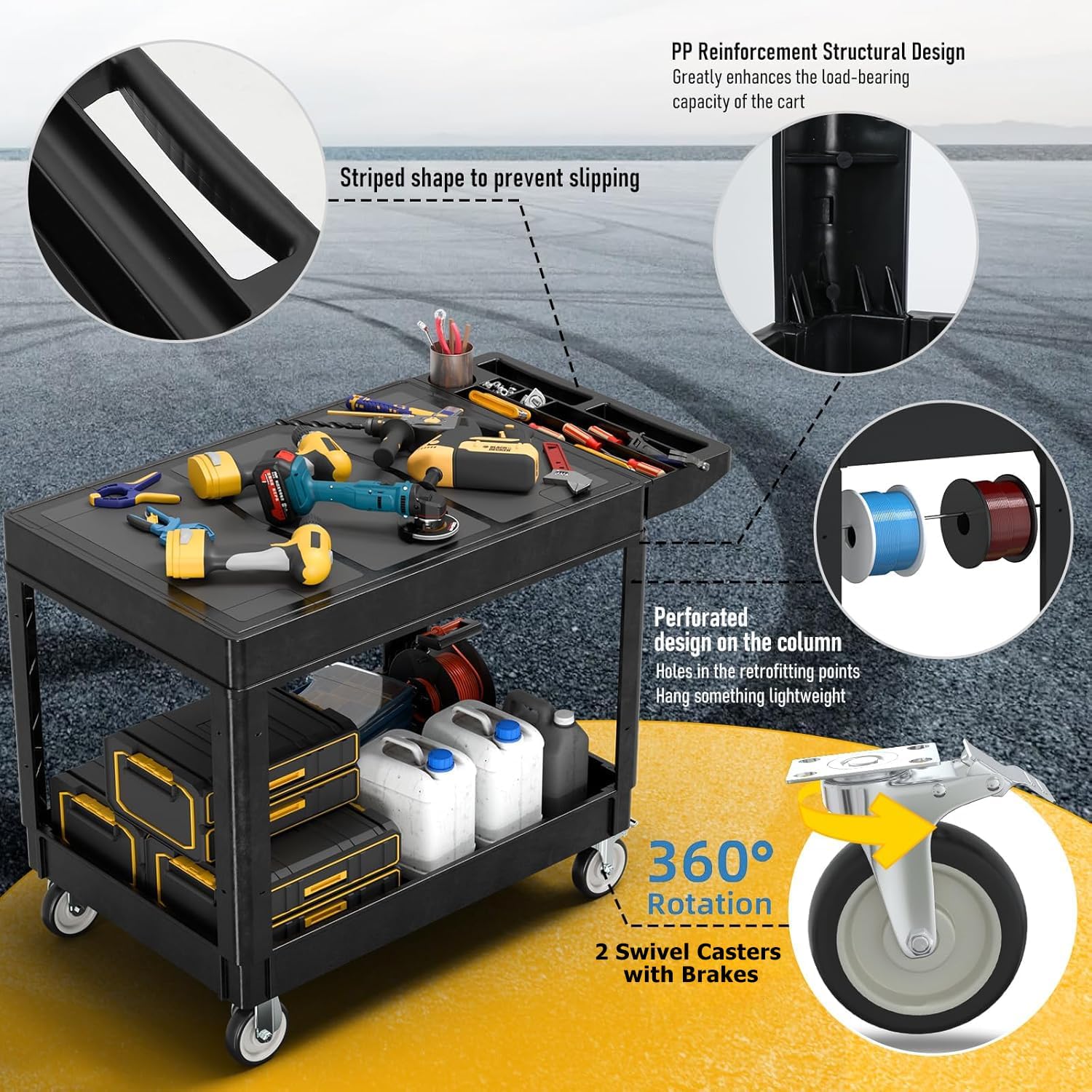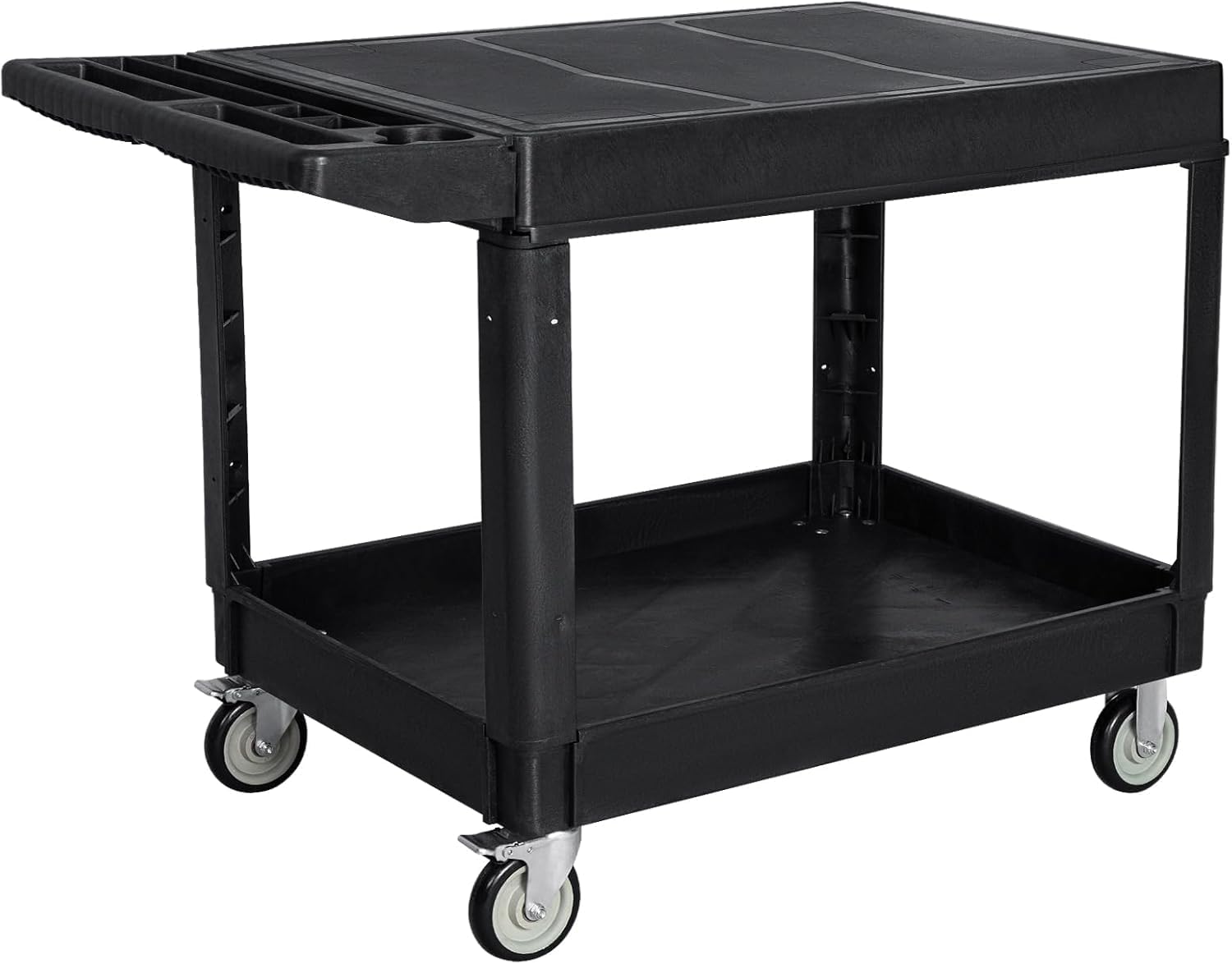 2 Tier Rolling Utility Cart on Wheels, 1000 lbs Capacity Flat Top Plastic Service Cart with Lipped Shelves, 46 x 26-Inch Heavy Duty Work Cart for Warehouse, Garage, Cleaning, Black