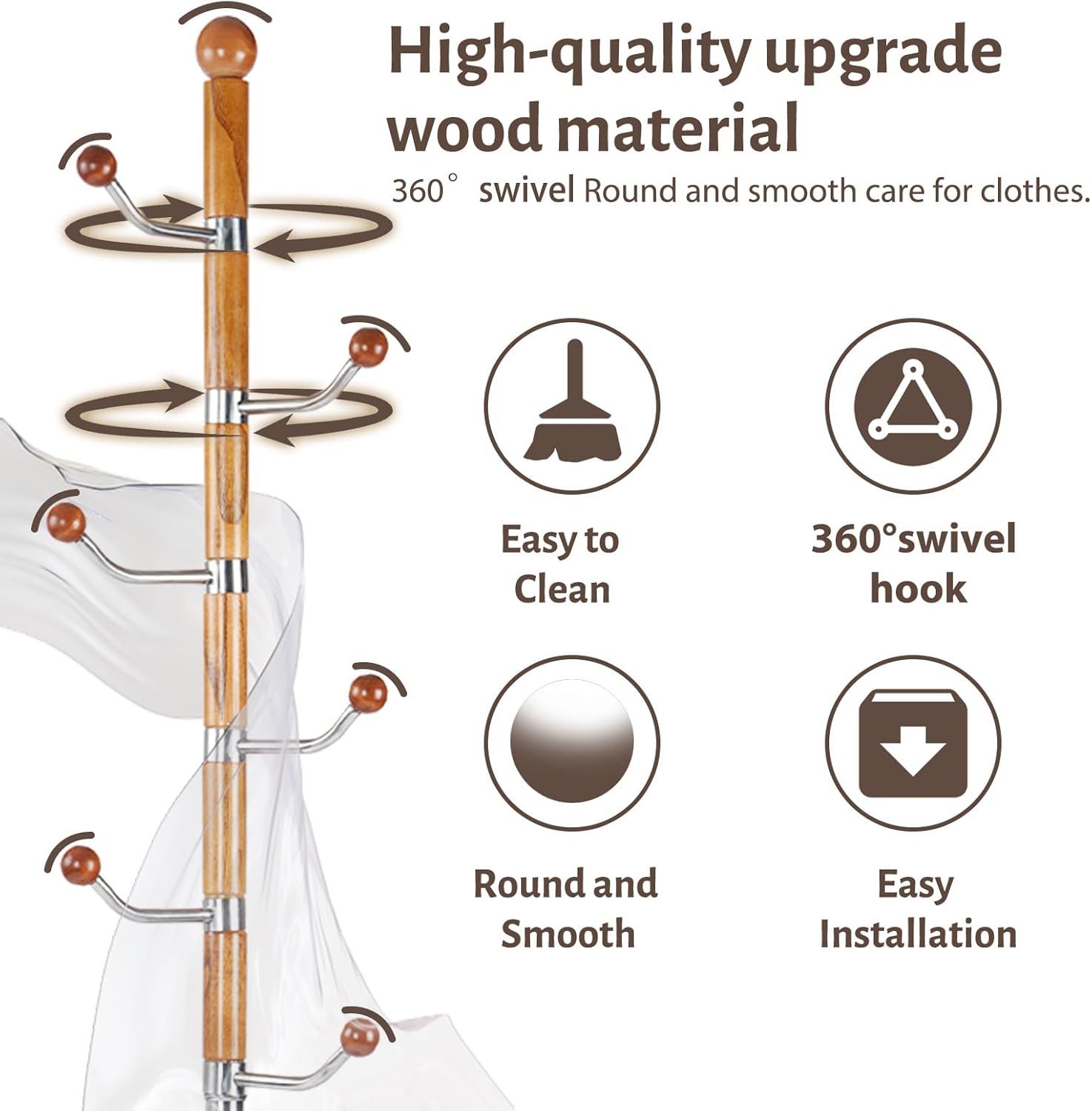 - 【Wider Application】The wooden coat tree is designed in a vintage style, with a simple structure and comprehensive functions. The coat rack can be placed in the hallway, living room, bedroom, office, and any corner you need. The wooden coat tree stand adopts an embedded screw design and is connected to the main pole, and the full-tooth screw is connected to the chassis. Equipped with installation tools and instructions, you can easily complete the installation.