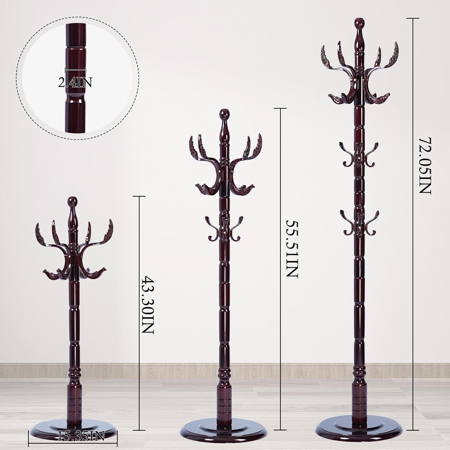 - 【Wider Application】The wooden coat tree is designed in a vintage style, with a simple structure and comprehensive functions. The coat rack can be placed in the hallway, living room, bedroom, office, and any corner you need. The wooden coat tree stand adopts an embedded screw design and is connected to the main pole, and the full-tooth screw is connected to the chassis. Equipped with installation tools and instructions, you can easily complete the installation.