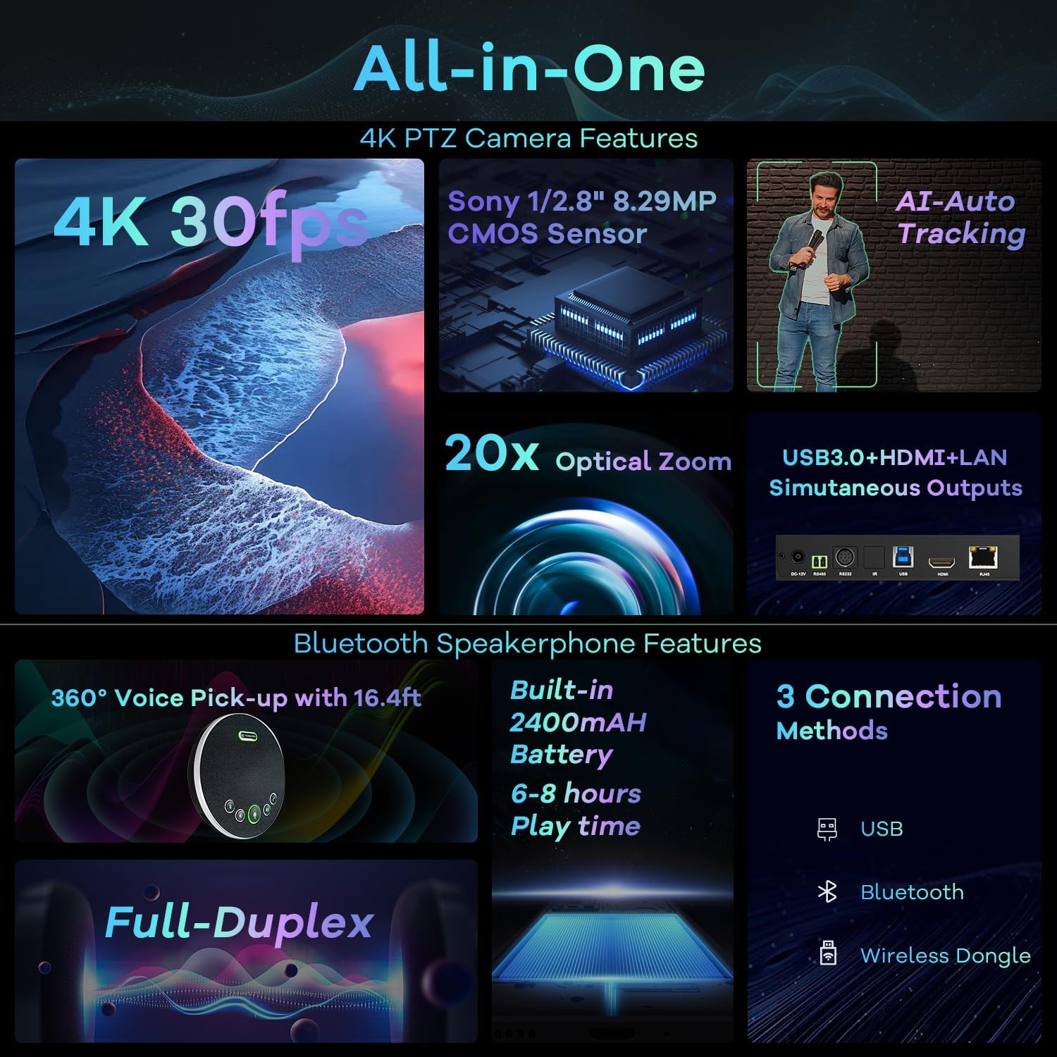 - âă4K PTZ Conference room camera systemăTONGVEO 4K PTZ Conference room camera system combines an upgraded 20x Zoom AI-auto Tracking Ultra HD 4K PTZ Camera and and conference Bluetooth speakerphone, the 4K PTZ Camera outputs 4K/30fps video streams to meet diverse image quality and smoothness,and the conference Speaker adopts Full duplex audio design, to speak and be heard simultaneously, This all-in-one design offers a cost-effective yet professional video and audio conferencing solution