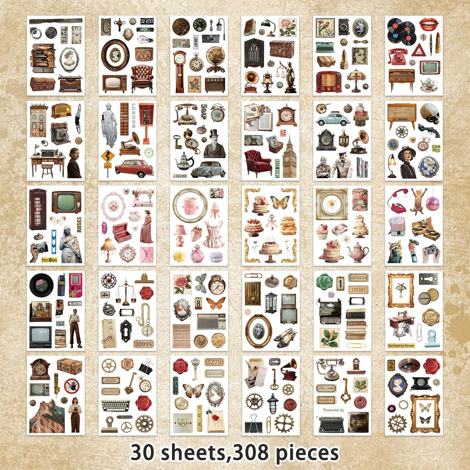 Vintage Sticker Book, 30 Sheets 308 Pcs Aesthetics Stickers for Journaling Scrapbooking Bullet Journals Planners Letter Card Making