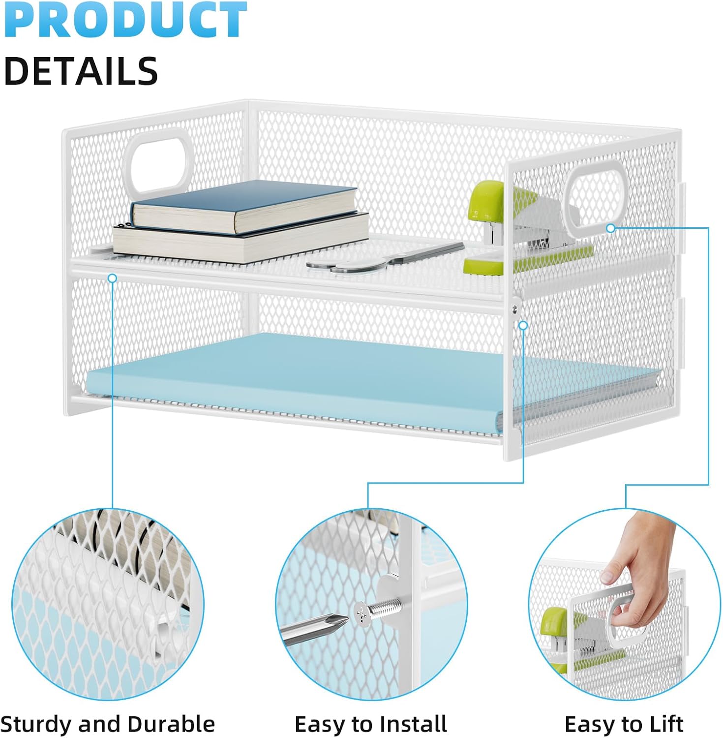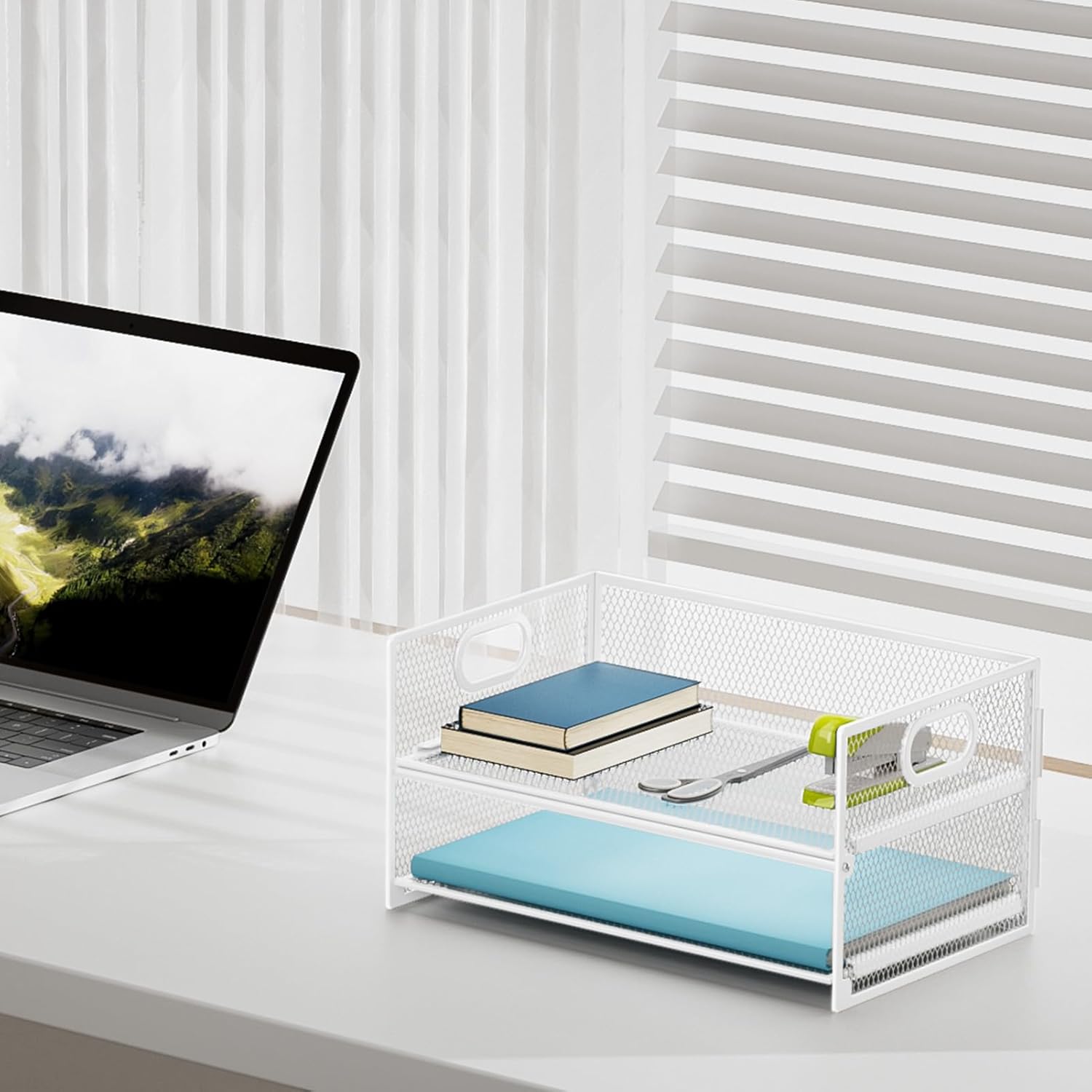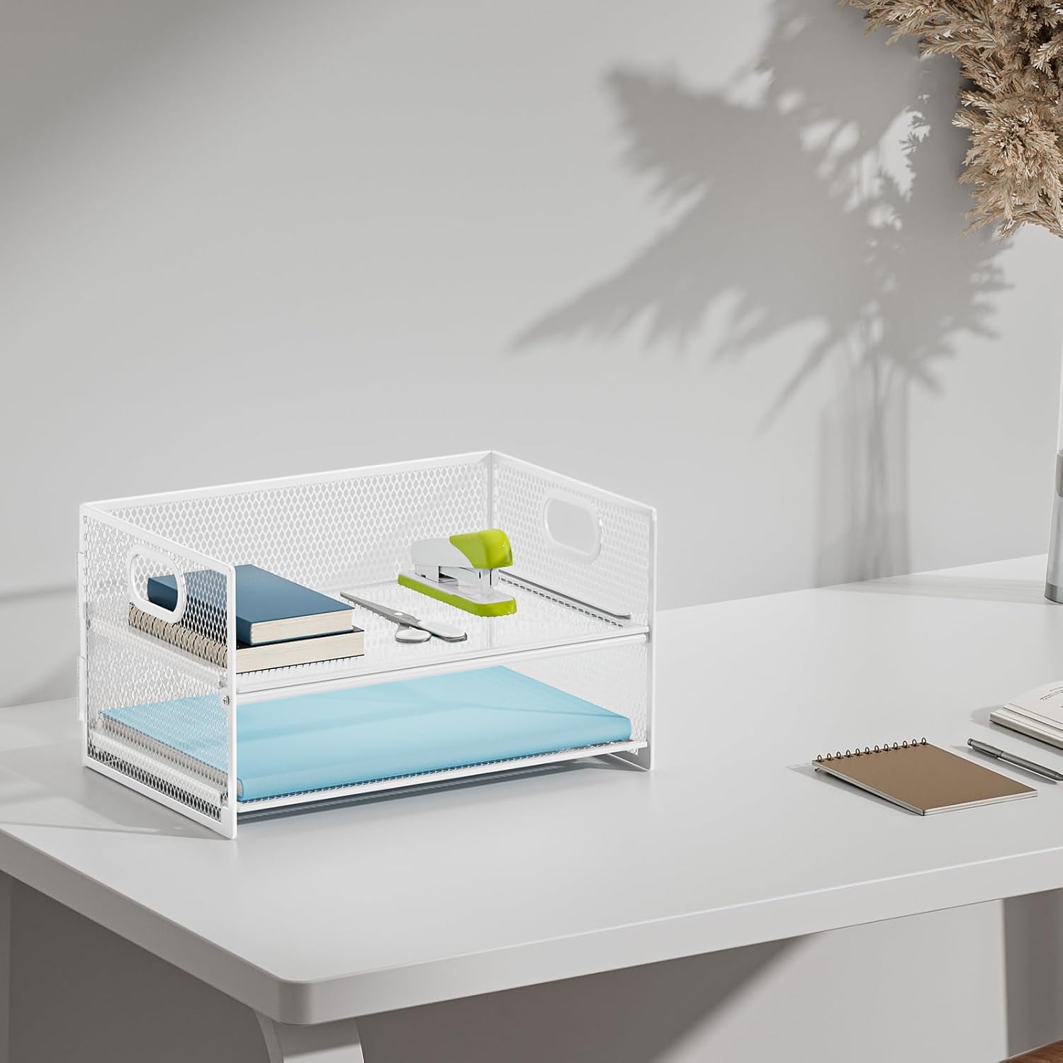 Marbrasse 2 Tier Paper Organizer Letter Tray, Mesh File Organizer with Handle, Paper Sorter Desk Organizer for Home Office Supplies - White