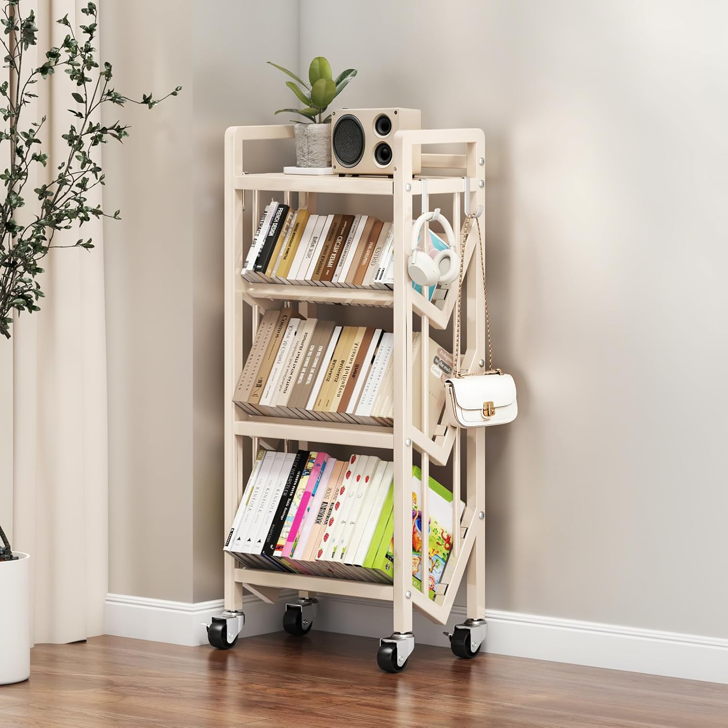 Bookshelf Movable Book Cart Multi-Layer Storage Rack Large-Capacity Rolling Cart L-Shaped Carbon Steel Shelf Suitable for Storing Books, Magazines, Newspapers, Shoes