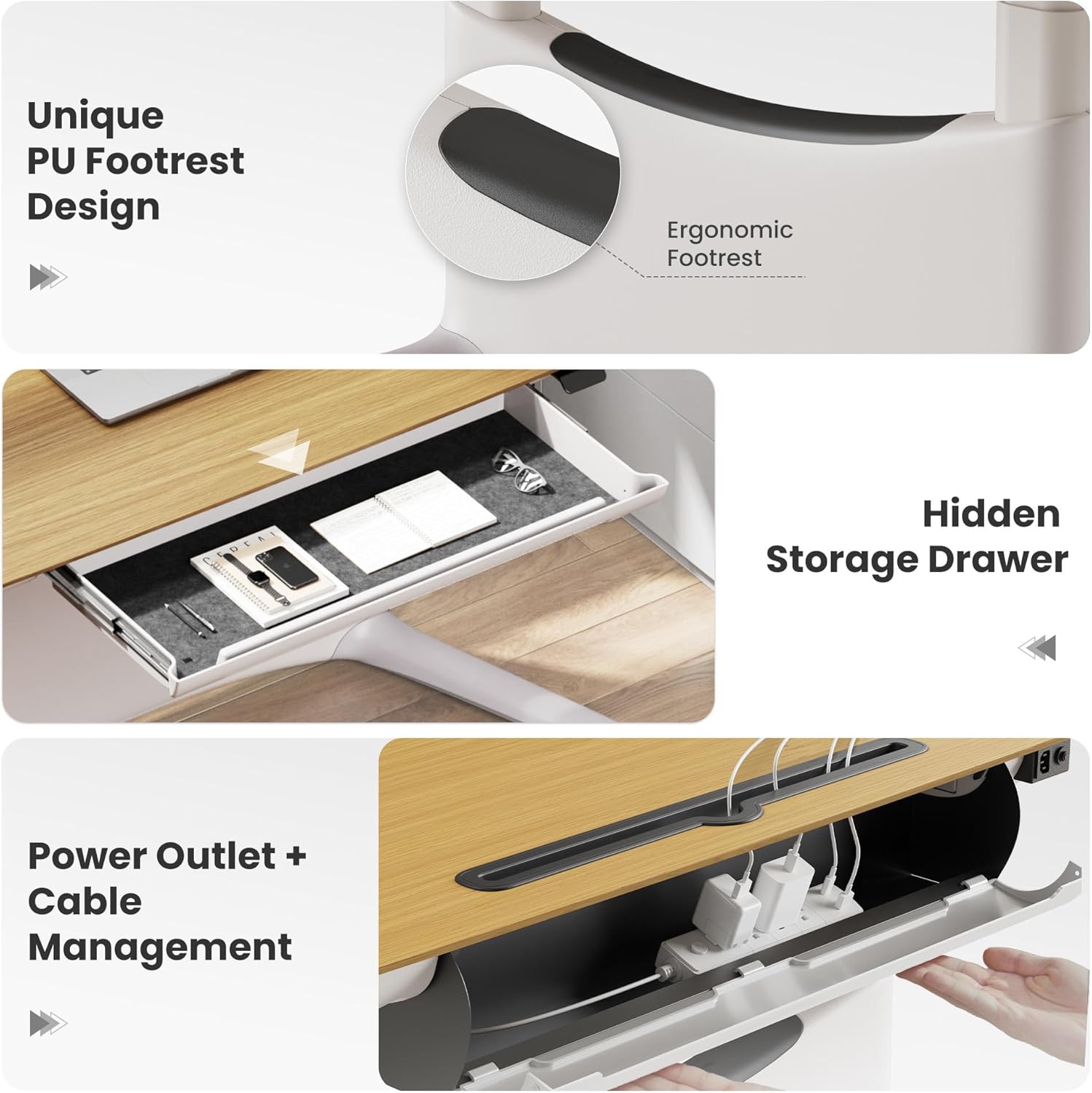 - Hidden Drawer & Organized Workspace: Unlike most standing desks, this one includes a large built-in drawer (25" wide) for easy storage of laptops, notebooks, and accessories. Combined with a rear cable tray + desktop grommet, it keeps your workstation clean, organized, and distraction-free.
