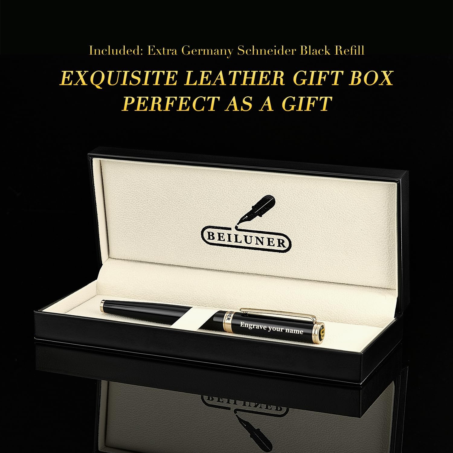 BEILUNER Silver Chrome Fountain Pen,Stunning Luxury Pens with 24K Gold Accents, Gorgeous 24K Gilded Nib(Fine) (Fine Nib,Black with Gold (Personalized))