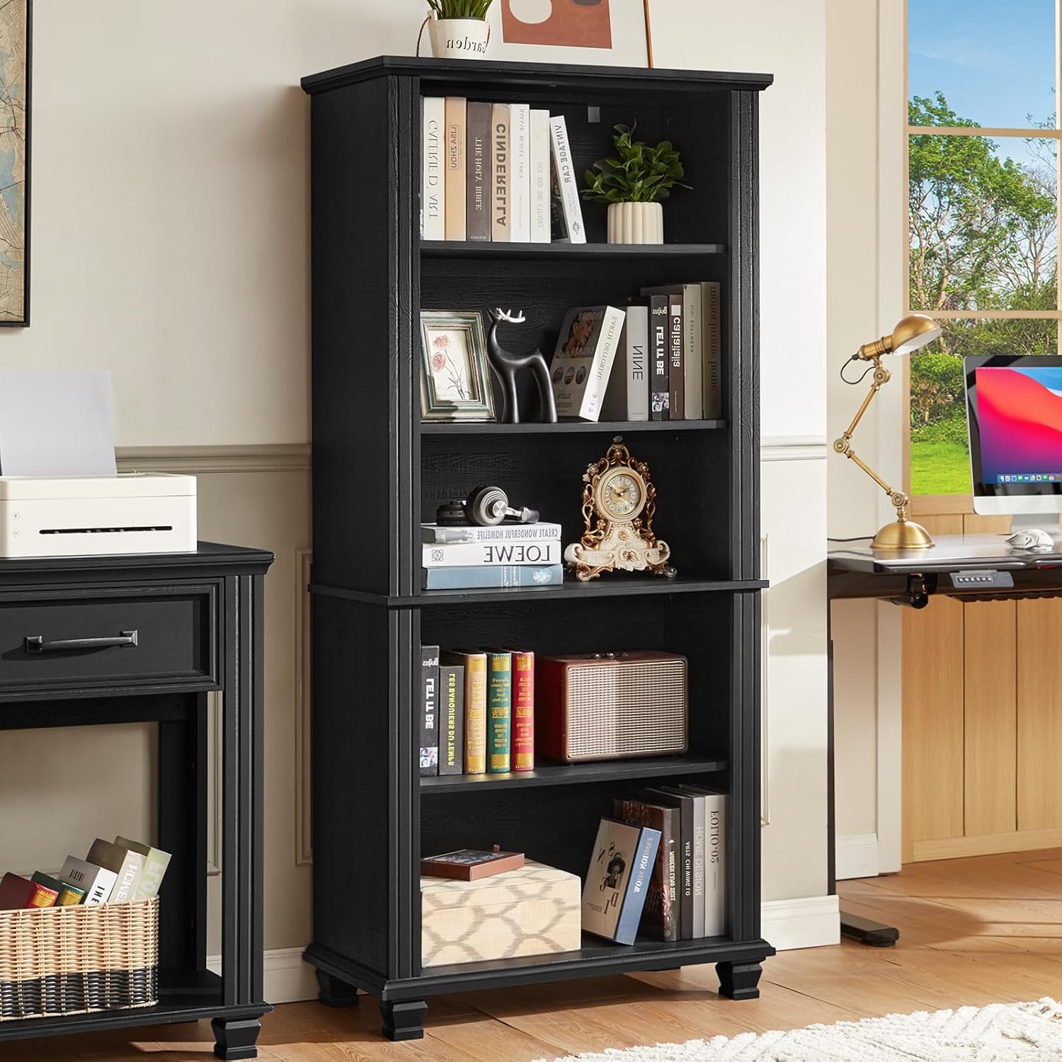 - [Rustic Style] This rustic bookshelf combines classic colors with modern linear design, which can be well integrated into rooms with different decorative styles, adding a touch of warmth to your space. You can also place this 5 - tier bookshelf in different locations as needed, such as the living room, office, study or library. This wooden bookshelf is available in four colors: walnut, black, white and green, providing you with a wide range of choices.