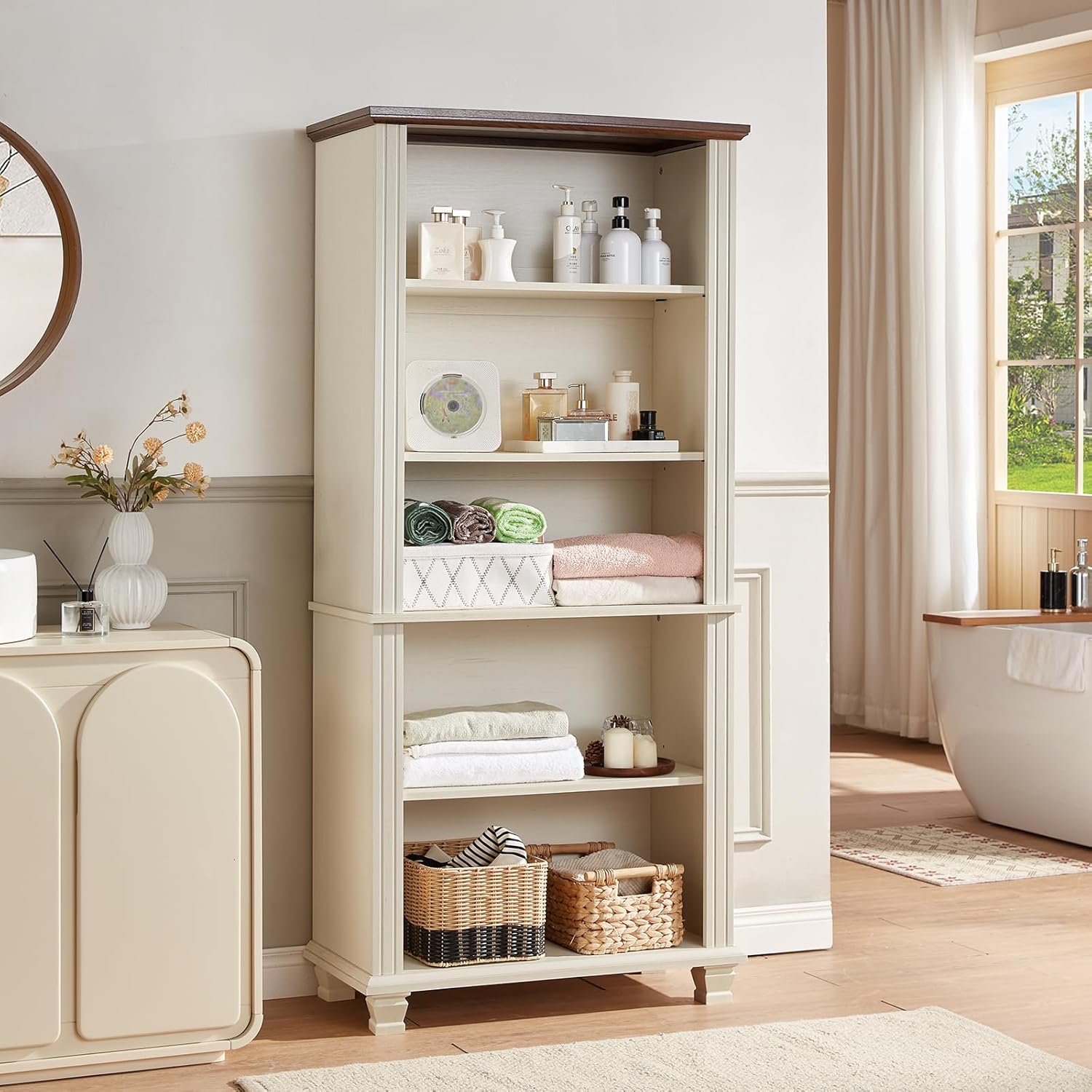 70" Tall White Bookshelf,5 Tier Wood Book Shelf with Adjustable Shelves & Wood Legs,Free Standing Farmhouse Bookcase with Open Display Storage,Vintage Kids Bookshelves for Nursery,Bedroom