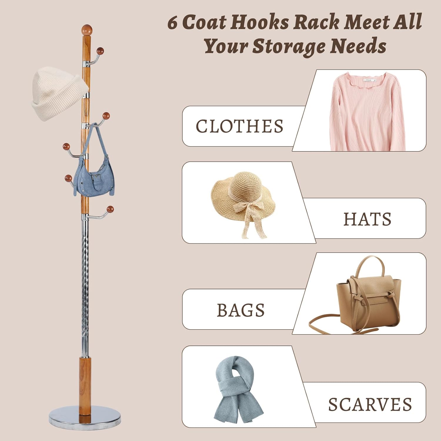 - Strong & Stable Construction for Everyday Use: Made from high-quality solid wood, this standing coat rack is built for reliable use. The resin hooks are sturdy, and the thickened, widened base provides extra stability, ensuring the rack stays upright even when holding heavy items like coats, bags, hats, or umbrellas.
