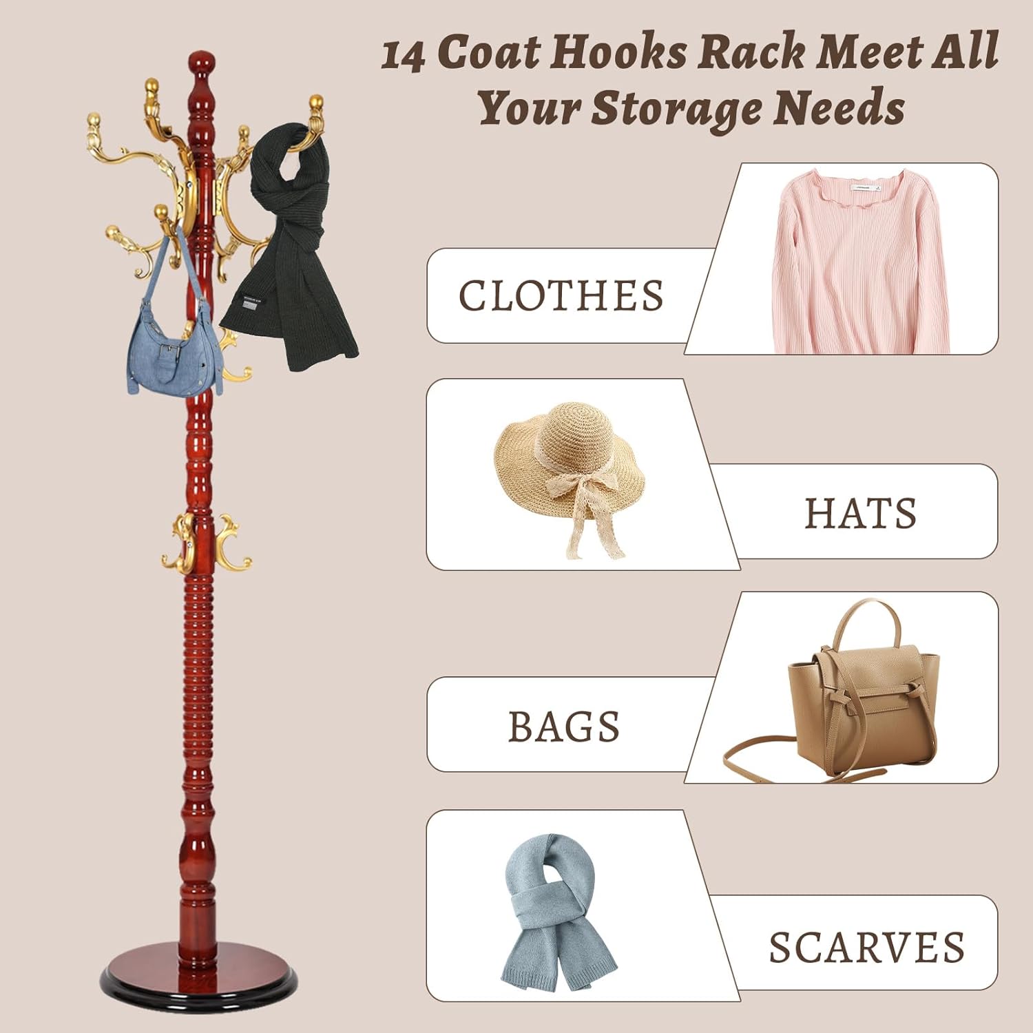 - Strong & Stable Construction for Everyday Use: Made from high-quality solid wood, this standing coat rack is built for reliable use. The resin hooks are sturdy, and the thickened, widened base provides extra stability, ensuring the rack stays upright even when holding heavy items like coats, bags, hats, or umbrellas.