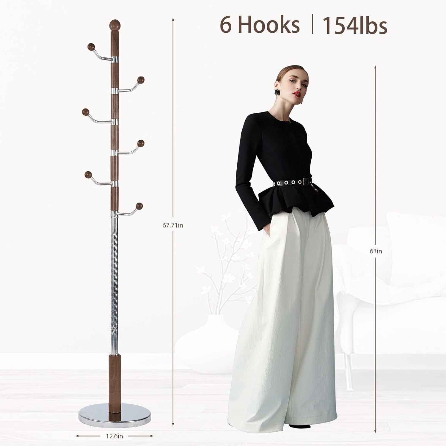 Coat Rack Freestanding, Metal Wooden Coat Tree with 6 Hooks, Heavy Duty Coat Hanger Stand with Resin and Stainless Steel Base, Free Standing Hall Tree for Scarf, Bag, Jacket (Walnut metal)