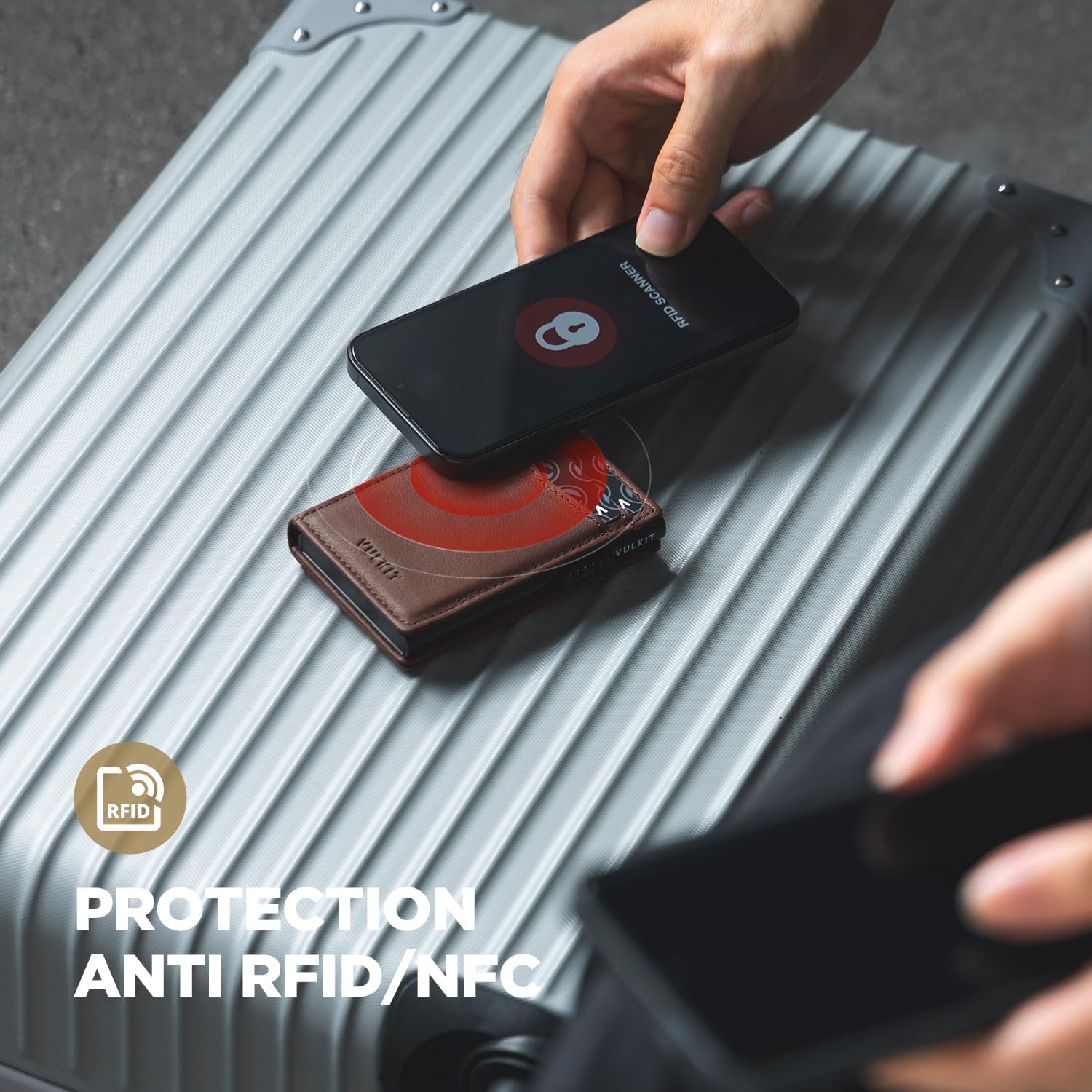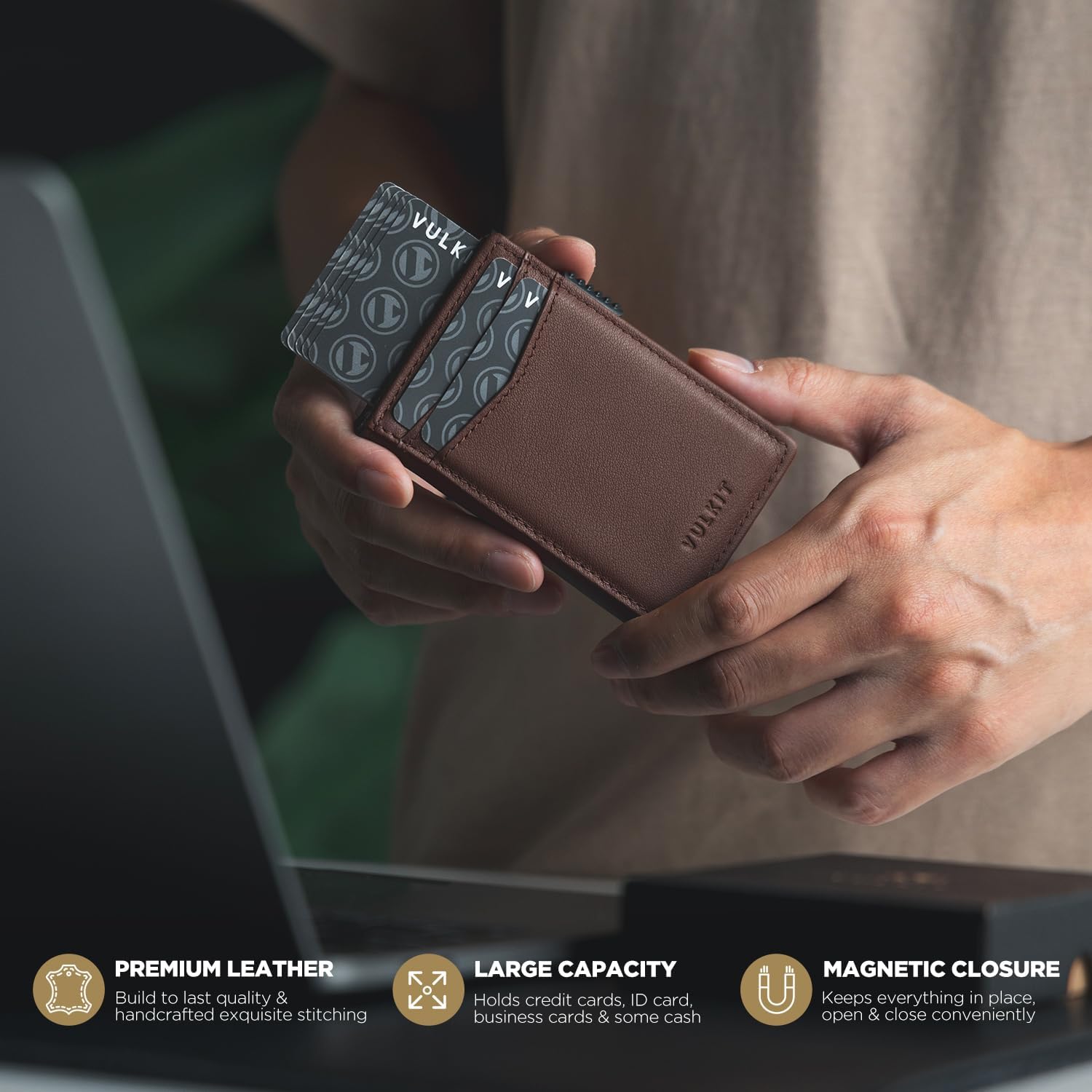 VULKIT Men's Wallet with ID Window Top Grain Leather RFID Blocking Minimalist Wallet Pop Up Card Holder Magnetic Closure